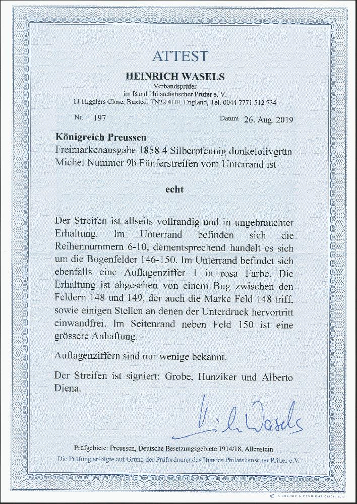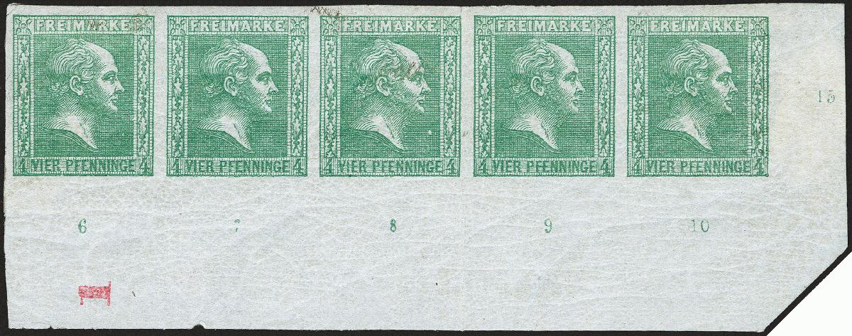 | Zusatzinformationen und Suchstichworte: | 372. Auktion Heinrich Köhler 14. Dezember 2019 Los 172 1858, Gittergrund 4 Pfennig dunkelolivgrün im waagerechten 5er-Streifen aus der rechten unteren Bogenecke, farbfrisch und allseits voll- bis breitrandig, rechts und unten mit ca. 9/18 mm Bogenrand, darauf Reihenzähler "12" sowie "6" bis "10" und rote Auflagen-Ziffer "1"; ungebraucht mit Originalgummi (im rechten Bogenrand größere Anhaftung). Ein senkrechter Bug zwischen Feld 148 und 149 berührt den ersten Wert leicht, der Unterdruck an wenigen Stellen leicht hervortretend, sonst einwandfrei. Es sind nur ganz wenige Einheiten mit Auflage-Ziffer registriert. Signiert Grobe, Hunziker und Alberto Diena sowie Fotoattest Wasels BPP (2019) Ausruf 2.000,00 EUR Zuschlag 8.000,00 EUR (aus der Sammlung Erivan Haub) |