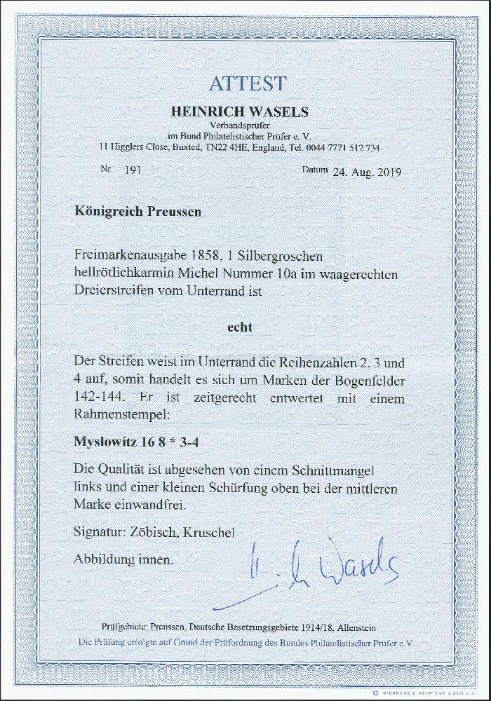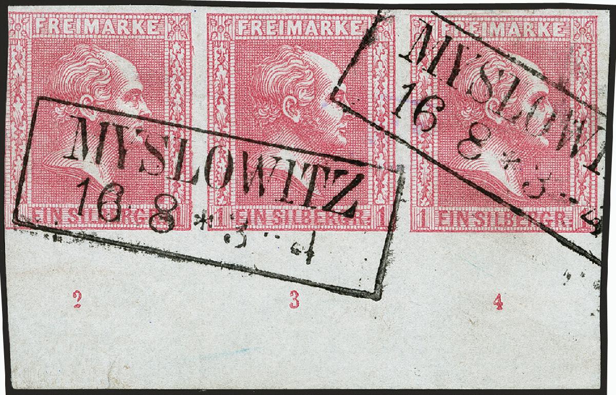 | Zusatzinformationen und Suchstichworte: | 372. Auktion Heinrich Köhler 14. Dezember 2019 Los 182 1858, Gittergrund 1 Silbergroschen rosa im waagerechter Unterrand-3er-Streifen, die linke Marke links etwas angeschnitten, sonst voll- bis breitrandig, unten mit ca. 14 mm Bogenrand mit Reihenzählern "2"-"4", sauber entwertet durch Rahmenstempel "MYSLOWITZ 16 8", die mittlere Marke ganz kleine Schürfung oben rechts. In dieser Form eine seltene Einheit. Signiert Zöbisch und Kruschel, Fotoattest Wasels BPP (2019) Ausruf 200,00 EUR Zuschlag 360,00 EUR (aus der Sammlung Erivan Haub) |