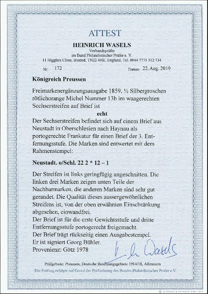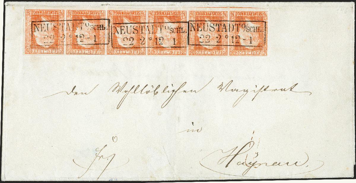 | Zusatzinformationen und Suchstichworte: | 372. Auktion Heinrich Köhler 14. Dezember 2019 Los 185 1859, Ergänzungswert ½ Silbergroschen rötlichorange im waagerechten 6er-Streifen, sehr schön farbfrisch, links leicht angeschnitten, sonst voll- bis überrandig mit Teilen von 3 Nachbarmarken, mit paarweise glasklar aufgesetztem Rahmenstempel "NEUSTADT O/SCHL. 22 2" auf Briefhülle nach Haynau mit rückseitigem Ausgabestempel. Ein attraktiver und seltener Brief mit der größten von uns registrierten Streifeneinheit dieser Marke auf Brief. Signiert Georg Bühler und Fotoattest Wasels BPP (2019) Ausruf 2.000,00 EUR Zuschlag 3.600,00 EUR (aus der Sammlung Erivan Haub) |
