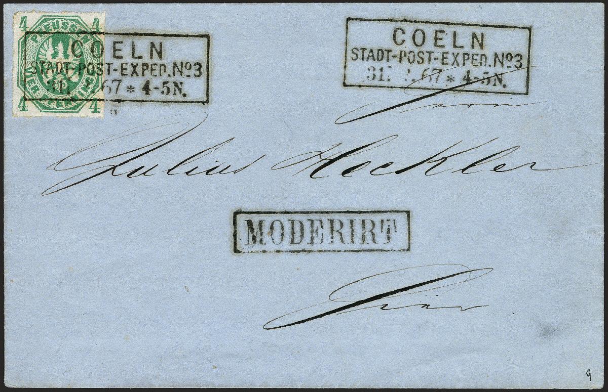 | Zusatzinformationen und Suchstichworte: | 372. Auktion Heinrich Köhler 14. Dezember 2019 Los 188 1861/64, Wappenausgabe 4 Pfennig dunkelgrün, farbfrisch und gut durchstochen (oben links minimalst eckrund) mit klar und gerade auf- und nebengesetztem Rahmenstempel "COELN STADT-POST-EXPED. No.3 31/12.67" auf Ortsbriefhülle mit sauber nebengesetztem Rahmenstempel "MODERIRT", rückseitig privater Eingangsvermerk vom 1.1.1868. Der Rahmenstempel "MODERIRT" ist nur von Köln bekannt; er wurde nur auf dem obersten von 100 gleichzeitig aufgegebenen Ortsbriefen abgeschlagen. Ein sehr dekorativer und in dieser Form einmaliger Letztagsbrief der preußischen Post in sehr schöner und frischer Erhaltung. Signiert Metzer und Kruschel sowie Qualitäts-Prüfungsbefund Maria Brettl (1987) Ausruf 500,00 EUR Zuschlag 6.500,00 EUR (aus der Sammlung Erivan Haub) |