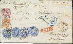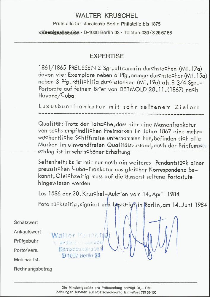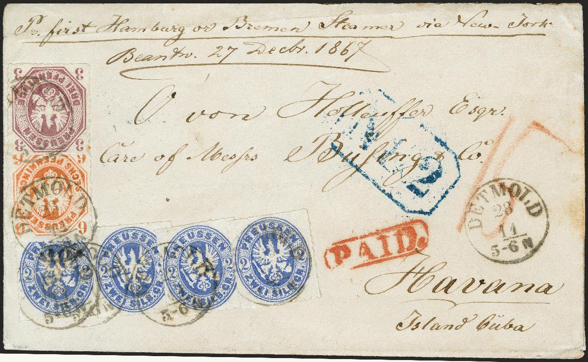 | Zusatzinformationen und Suchstichworte: | 372. Auktion Heinrich Köhler 14. Dezember 2019 Los 209 3 Pfennig graulila, 6 Pfennig orange und 4 Stück 2 Silbergroschen blau, die 6 Pfennig leicht sulfidiert, sonst alle farbfrisch und gut durchstochen, mit mehrfach auf- und nebengesetztem Taxis-EKr. "DETMOLD 28 6" (1867) auf Briefkuvert über Bremen nach Havanna, Kuba. Der Brief ist frankiert nach dem Tarif von 1854 für die britischen Gebiete in der Karibik und zu diesem unbeanstandet befördert; rückseitig Ankunftsstempel von Havanna, sehr spät, vom 21.12. Ein für diese Destination sehr frischer Brief. Die Destination Kuba ist für Preußen außerordentlich selten, wir haben nur 2 weitere Briefe dorthin registriert. Signiert Kruschel Ausruf 3.000,00 EUR Zuschlag 6.000,00 EUR (aus der Sammlung Erivan Haub) |