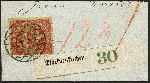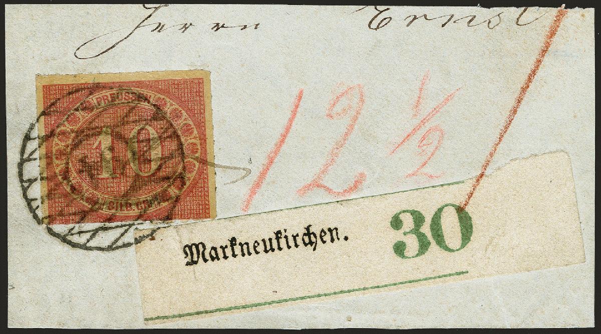 | Zusatzinformationen und Suchstichworte: | 372. Auktion Heinrich Köhler 14. Dezember 2019 Los 211 1866, Innendienstmarke 10 Groschen rosa, farbfrisch und einwandfrei durchstochen mit klar aufgesetztem sächsischen Nummernstempel "94" MARKNEUKIRCHEN auf größerem Briefstück eines Paketbegleitbriefes mit nebengeklebten Paketzettel. Ein ganz ungewöhnliches und in dieser Form seltenes Stück. Signiert H. Krause und Fotoattest Wasels BPP (2019) Ausruf 300,00 EUR Zuschlag 1.300,00 EUR (aus der Sammlung Erivan Haub) |