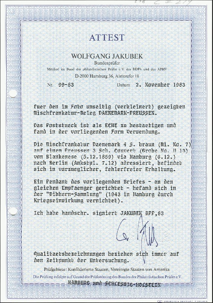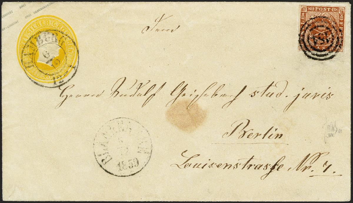 | Zusatzinformationen und Suchstichworte: | 372. Auktion Heinrich Köhler 14. Dezember 2019 Los 229 1855, Umschlag 3 Silbergroschen gelb mit Zufrankatur Dänemark 1858/62, 4 Skilling braun, voll- bis breitrandig mit sauberer Nr. "154" und entsprechendem, nebengesetztem holsteinischen EKr. "BLANKENESE 5/12 1859" nach Berlin mit rückseitigem Ausgangsstempel. Die dänische Marke bezahlte das Porto bis Hamburg, die Strecke von Hamburg bis Berlin wurde durch die 3 Silbergroschen-Ganzsache bezahlt, erst dort entwertet durch DKr. "HAMBURG 6/12". Vorderseitig kleiner Siegelfleck, sonst einwandfreie und sehr schöne Erhaltung. Es sind einige wenige derartige Kombinationen registriert, die anderen jedoch fast alle aus Altona stammend. Eine bemerkenswerte Mischfrankatur. Fotoatteste Jakubek BPP (1983) und Slavomir Kaiser (1979) Ausruf 4.000,00 EUR Zuschlag 7.000,00 EUR (aus der Sammlung Erivan Haub) |