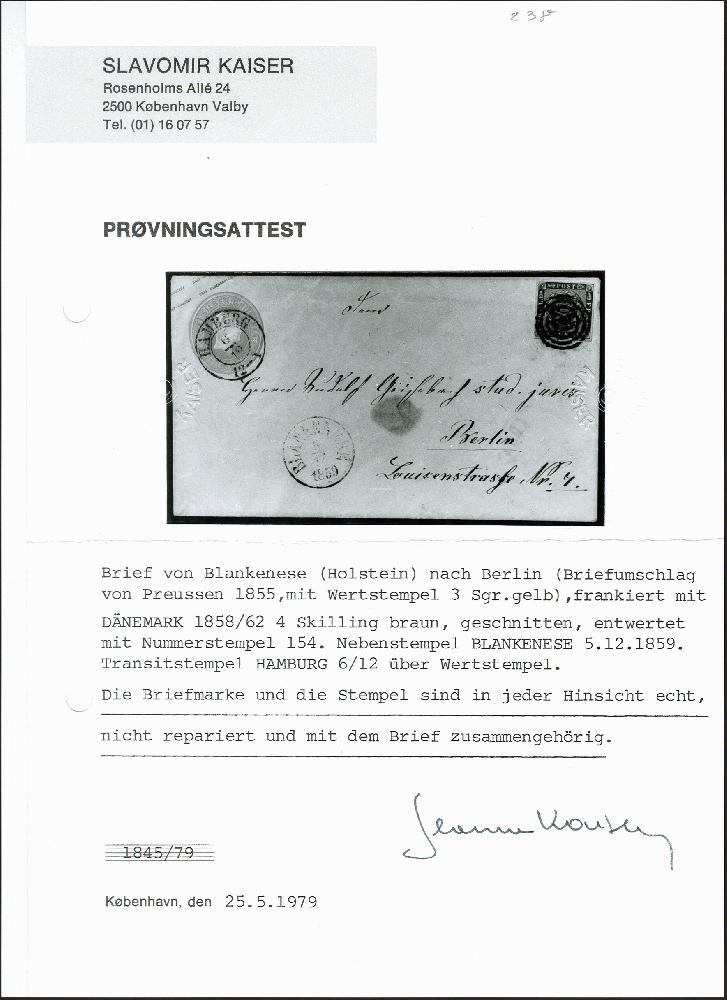 | Zusatzinformationen und Suchstichworte: | 372. Auktion Heinrich Köhler 14. Dezember 2019 Los 229 1855, Umschlag 3 Silbergroschen gelb mit Zufrankatur Dänemark 1858/62, 4 Skilling braun, voll- bis breitrandig mit sauberer Nr. "154" und entsprechendem, nebengesetztem holsteinischen EKr. "BLANKENESE 5/12 1859" nach Berlin mit rückseitigem Ausgangsstempel. Die dänische Marke bezahlte das Porto bis Hamburg, die Strecke von Hamburg bis Berlin wurde durch die 3 Silbergroschen-Ganzsache bezahlt, erst dort entwertet durch DKr. "HAMBURG 6/12". Vorderseitig kleiner Siegelfleck, sonst einwandfreie und sehr schöne Erhaltung. Es sind einige wenige derartige Kombinationen registriert, die anderen jedoch fast alle aus Altona stammend. Eine bemerkenswerte Mischfrankatur. Fotoatteste Jakubek BPP (1983) und Slavomir Kaiser (1979) Ausruf 4.000,00 EUR Zuschlag 7.000,00 EUR (aus der Sammlung Erivan Haub) |