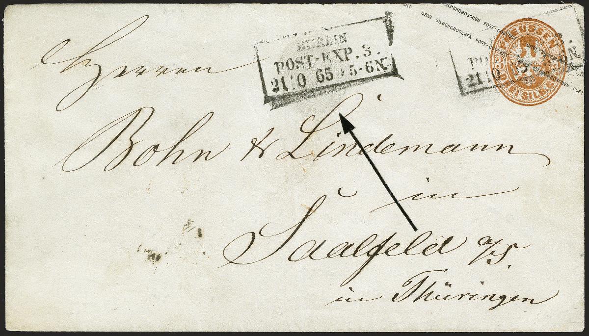 | Zusatzinformationen und Suchstichworte: | 372. Auktion Heinrich Köhler 14. Dezember 2019 Los 239 1863, Umschlag 3 Silbergroschen braun mit zusätzlichem Wertstempel im Blinddruck oben in der Mitte des Umschlages, beide Wertstempel mit Rahmenstempel "BERLIN POST-EXP.3 / 21 10 65" entwertet, adressiert nach Saalfeld in Thüringen mit Ankunftsstempel vom nächsten Tag. Leichte senkrechte Faltspur durch den Blinddruck gehend, sonst gute Bedarfserhaltung. Derartige Abarten sind bei den Ganzsachenumschlägen Preußens außerordentlich selten (wir haben noch 3 Stücke mit farbigen Doppelprägungen registriert). Signiert Drahn, Kruschel und Metzer sowie Fotoattest Wasel BPP (2019). Ausruf 2.000,00 EUR unverkauft (aus der Sammlung Erivan Haub) |