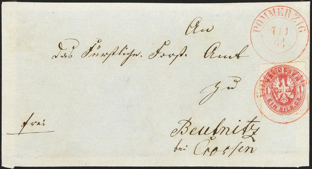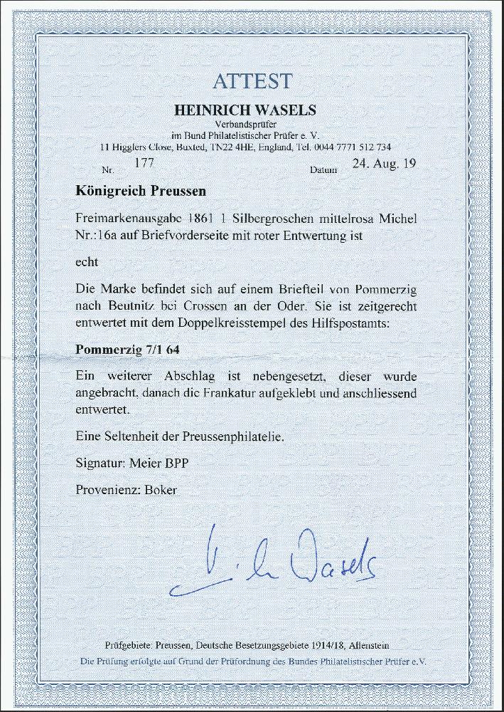 | Zusatzinformationen und Suchstichworte: | 372. Auktion Heinrich Köhler 14. Dezember 2019 Los 254 "POMMERZIG 7/1 64", roter DKr. sauber auf- und nebengesetzt auf Wappenausgabe 1 Silbergroschen rosa auf Briefvorderseite nach Beutnitz bei Crossen. Ein besonders schönes Stück mit dem seltensten der roten Stempel der Hilfspostämter; neben dem hier angebotenen Stück haben wir nur noch eine Ganzsache und 2 Briefstücke registriert. Signiert Meier BPP und Fotoattest Wasels BPP (2019) Ausruf 800,00 EUR Zuschlag 1.400,00 EUR (aus der Sammlung Erivan Haub) |