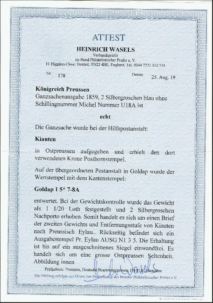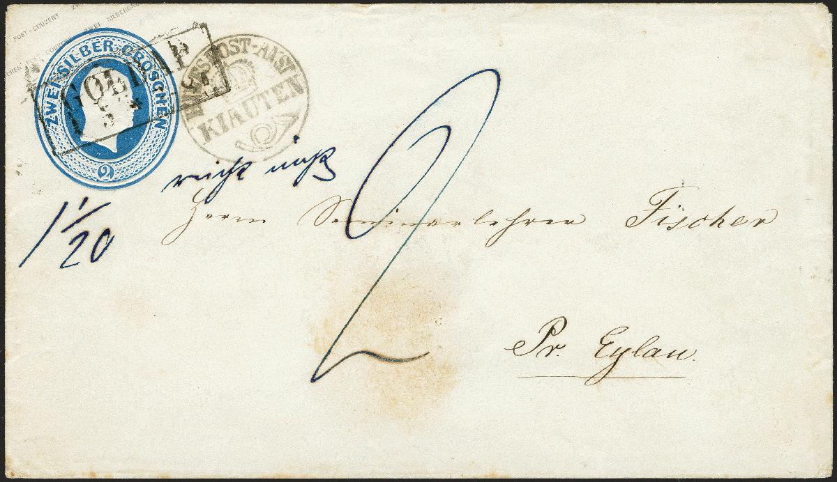| Zusatzinformationen und Suchstichworte: | 372. Auktion Heinrich Köhler 14. Dezember 2019 Los 255 "HILFSPOST-ANST. KIAUTEN", Krone-Posthorn-Stempel nebengesetzt auf Umschlag 2 Silbergroschen blau, der Wertstempel entwertet mit Rahmenstempel der übergeordneten Postanstalt "GOLDAP 1 5" nach preußisch Eylau mit rückseitigem Ausgabestempel. Der Brief fiel in die 2. Gewichtsstufe und wurde entsprechend mit "2" Silbergroschen Nachporto belegt. Rückseitiges Siegel ausgeschnitten, sonst einwandfrei. Ein attraktiver und seltener Ostpreußen-Beleg. Fotoattest Wasels BPP (2019) Ausruf 1.000,00 EUR Zuschlag 1.700,00 EUR (aus der Sammlung Erivan Haub) |