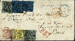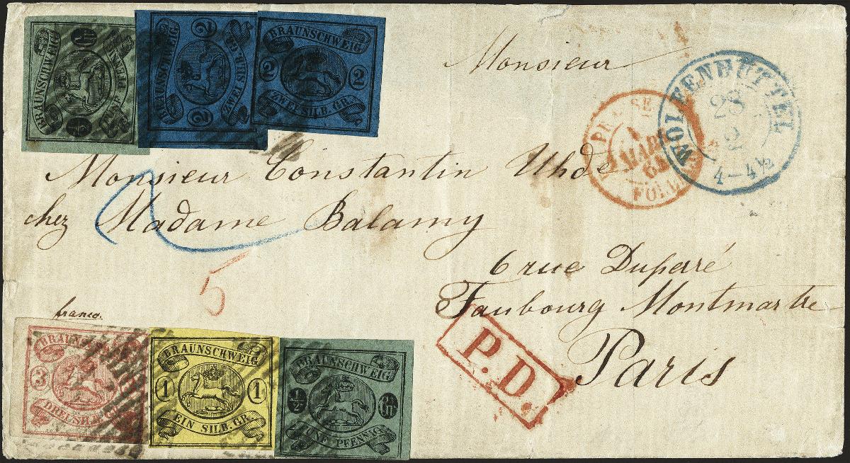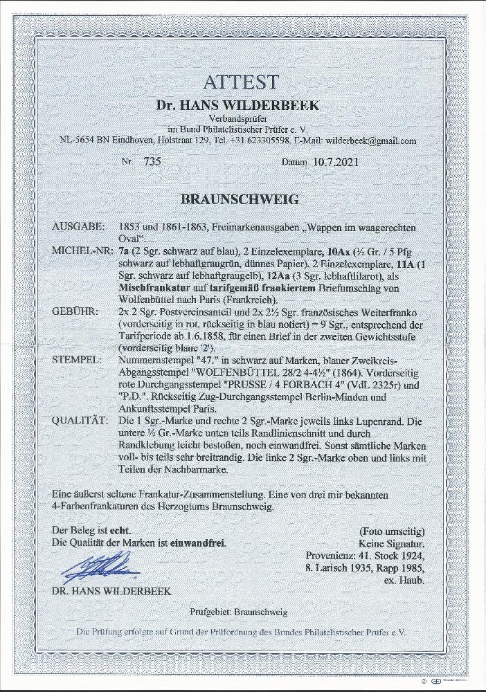 | Zusatzinformationen und Suchstichworte: | 377. Auktion Heinrich Köhler 20. - 25. September 2021 Los 30 1853, 2 Silbergroschen schwarz auf blau, 2 Einzelwerte in Mischfrankatur mit 2 Einzelwerten 1861/63, ½ Groschen schwarz auf lebhaftgraugrün, 1 Silbergroschen schwarz auf lebhaftgraugelb und 3 Silbergroschen rosa, alle farbfrisch, 3 Werte einseitig lupenrandig bzw. Randlinienschnitt, die unten klebende ½ Groschen-Marke durch Randklebung unten gering bestoßen, sonst alle einwandfrei, mit Nummer "47" und nebengesetztem blauen Doppelkreisstempel "WOLFENBÜTTEL 28/2" auf Briefkuvert der 2. Gewichtsstufe nach Paris mit Transit- und Ankunftsstempeln. Etwa die Hälfte der rückseitigen Verschlußklappe fehlt; im Kuvert außerhalb der Frankatur 2 senkrechte Büge, sonst einwandfrei. Der Brief ist mit 9 Silbergroschen portogerecht frankiert, der französische Portoanteil von "5" Silbergroschen vorderseitig notiert. Ein sensationeller Auslandsbrief; es sind nur 2 weitere Vierfarbenfrankaturen des Herzogtums Braunschweig registriert. Fotoatteste Brettl BPP (1985) und Dr. Wilderbeek BPP (2021) Ausruf 5.000,00 EUR Zuschlag 70.000 EUR (aus der Sammlung Erivan Haub) |