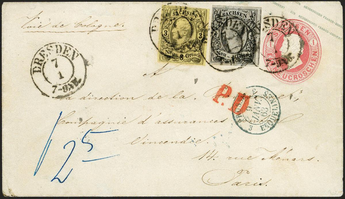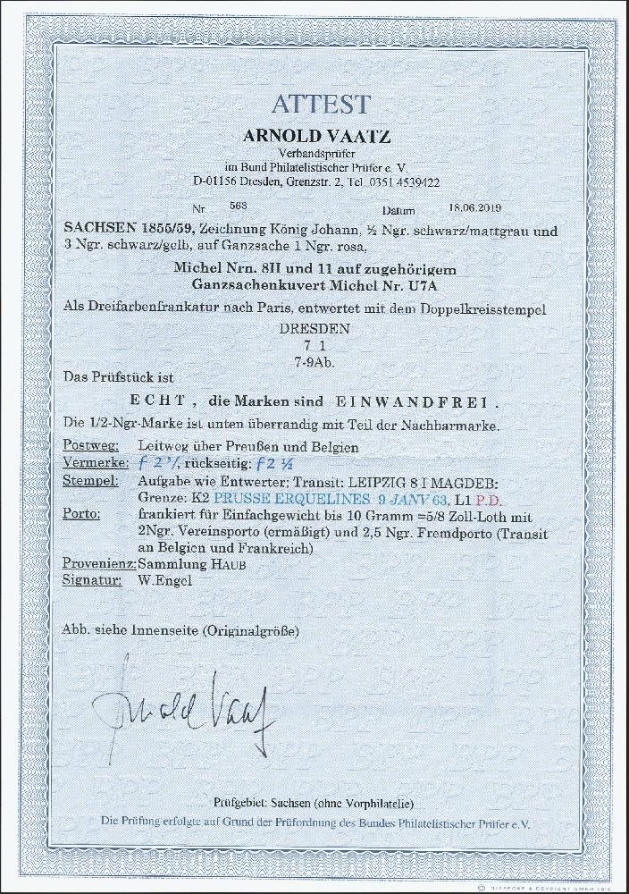 | Zusatzinformationen und Suchstichworte: | 372. Auktion Heinrich Köhler 14. Dezember 2019 Los 262 ½ Neugroschen schwarz auf mattgrau, Type II, und 3 Neugroschen schwarz auf gelb, beide voll- bis breitrandig, die ½ Neugroschen mit Teil der rechten Nachbarmarke, mit DKr. "DRESDEN 7 1" auf Ganzsachenumschlag 1862, 1 Neugroschen rosa im Kleinformat mit Leitvermerk "Voie de Cologne" nach Paris mit Transit- und Ankunftsstempeln. Der Umschlag außerhalb der Frankatur geringe Bugspur, sonst tadellos. Signiert W. Engel und Fotoattest Vaatz BPP (2019) Ausruf 300,00 EUR Zuschlag 1.500,00 EUR (aus der Sammlung Erivan Haub) |