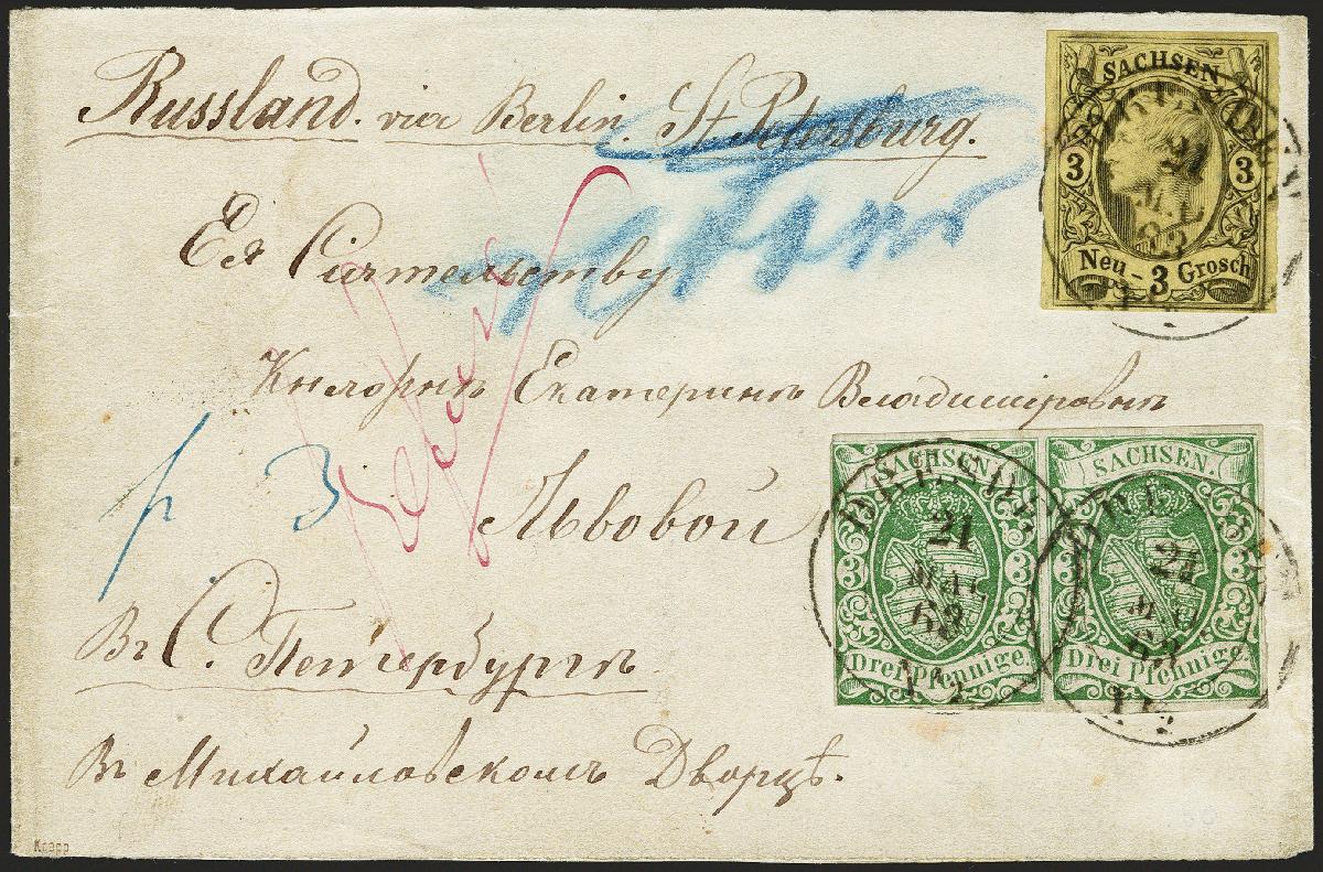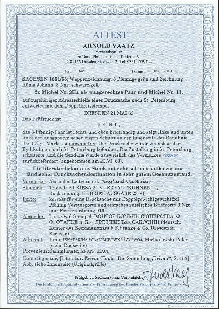 | Zusatzinformationen und Suchstichworte: | 372. Auktion Heinrich Köhler 14. Dezember 2019 Los 263 1851/63, Wappenausgabe, 3 Pfennig grün im waagerechten Paar, die linke Marke etwas berührt, sonst voll- bis breitrandig, zusammen mit voll- bis breitrandiger Johann 3 Neugroschen schwarz auf gelb, mit jeweils sauber aufgesetztem DKr. "DRESDEN 21 MAI 63" auf Drucksachenstreifband der 2. Gewichtsstufe über Eydtkuhnen nach St. Petersburg. Offensichtlich verweigerte der Empfänger die Annahme, entsprechende Vermerke "refusé" und "retour". Die Drucksache ist für die 2. Gewichtsstufe portogerecht frankiert mit zweimal 3 Pfennig Vereinsporto und 3 Neugroschen russischem Anteil (dieser vorderseitig vermerkt). Eine außerordentlich seltene und attraktive Auslandsdrucksache; wir haben kein vergleichbares Stück registriert. Signiert Knapp und Fotoattest Vaatz BPP (2019) Ausruf 3.000,00 EUR Zuschlag 6.500,00 EUR (aus der Sammlung Erivan Haub) |