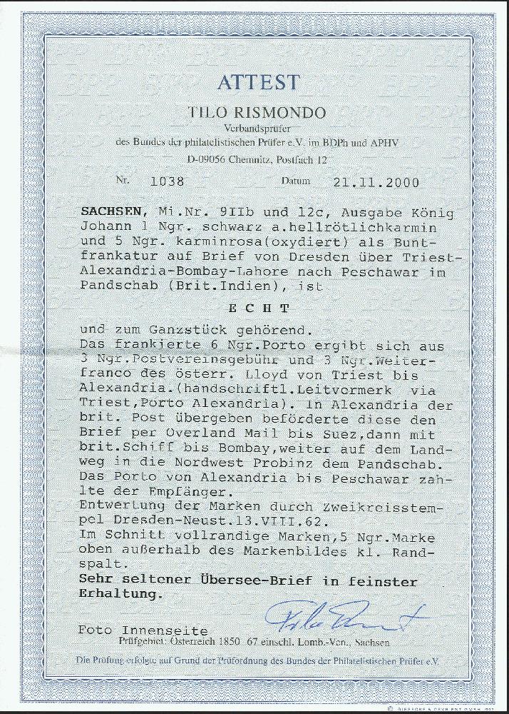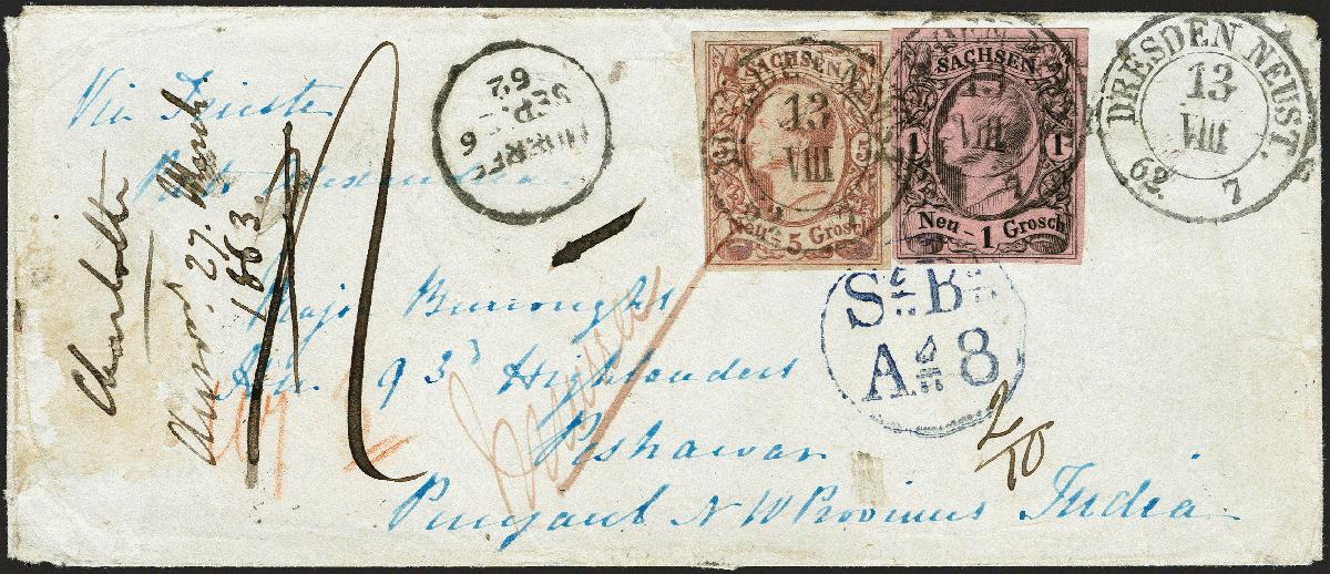 | Zusatzinformationen und Suchstichworte: | 372. Auktion Heinrich Köhler 14. Dezember 2019 Los 264 1855/56, Johann 1 Neugroschen schwarz auf hellrötlichkarmin und 5 Neugroschen bräunlichrot mit klar auf- und nebengesetztem DKr. "DRESDEN NEUST. 13 VIII 62" auf kleinem Briefkuvert über Triest, Alexandria und die Overland Mail an einen Major des 93. Highlander-Regimentes zu Fuß nach Peshawar im Punjab, Indien. Das verklebte Franko bezahlt die Strecke bis Alexandria mit 3 Neugroschen Vereinsporto und 3 Neugroschen österreichischem Seeporto (rückseitiger Stempel "15"). In Alexandria wurde der Brief mit "1/-" für den Weitertransport belastet, in Indien der Stempel "St. Bg.A.8" (Steamer Bearing 8 Anna) angebracht. Vorder- und rückseitig diverse Transitstempel sowie Ankunftsstempel vom 19. September 1862. Die 5 Neugroschen-Marke etwas sulfidiert und leichter Eckbug oben rechts, sonst - insbesondere für diese Destination - sehr gute und ursprüngliche Erhaltung. Fotoatteste Rismondo BPP (2000) und Vaatz BPP (2019) Ausruf 5.000,00 EUR Zuschlag 5.500,00 EUR (aus der Sammlung Erivan Haub) |