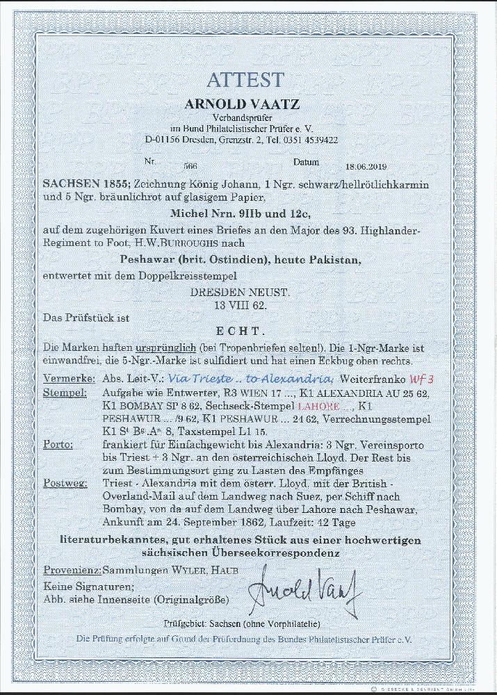 | Zusatzinformationen und Suchstichworte: | 372. Auktion Heinrich Köhler 14. Dezember 2019 Los 264 1855/56, Johann 1 Neugroschen schwarz auf hellrötlichkarmin und 5 Neugroschen bräunlichrot mit klar auf- und nebengesetztem DKr. "DRESDEN NEUST. 13 VIII 62" auf kleinem Briefkuvert über Triest, Alexandria und die Overland Mail an einen Major des 93. Highlander-Regimentes zu Fuß nach Peshawar im Punjab, Indien. Das verklebte Franko bezahlt die Strecke bis Alexandria mit 3 Neugroschen Vereinsporto und 3 Neugroschen österreichischem Seeporto (rückseitiger Stempel "15"). In Alexandria wurde der Brief mit "1/-" für den Weitertransport belastet, in Indien der Stempel "St. Bg.A.8" (Steamer Bearing 8 Anna) angebracht. Vorder- und rückseitig diverse Transitstempel sowie Ankunftsstempel vom 19. September 1862. Die 5 Neugroschen-Marke etwas sulfidiert und leichter Eckbug oben rechts, sonst - insbesondere für diese Destination - sehr gute und ursprüngliche Erhaltung. Fotoatteste Rismondo BPP (2000) und Vaatz BPP (2019) Ausruf 5.000,00 EUR Zuschlag 5.500,00 EUR (aus der Sammlung Erivan Haub) |