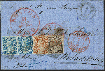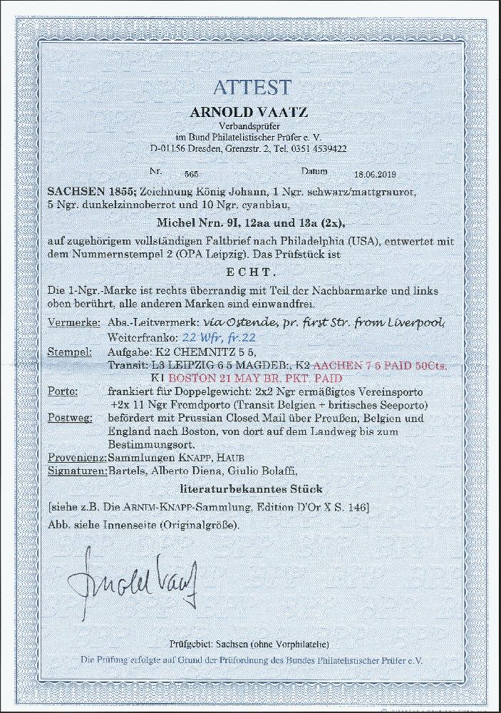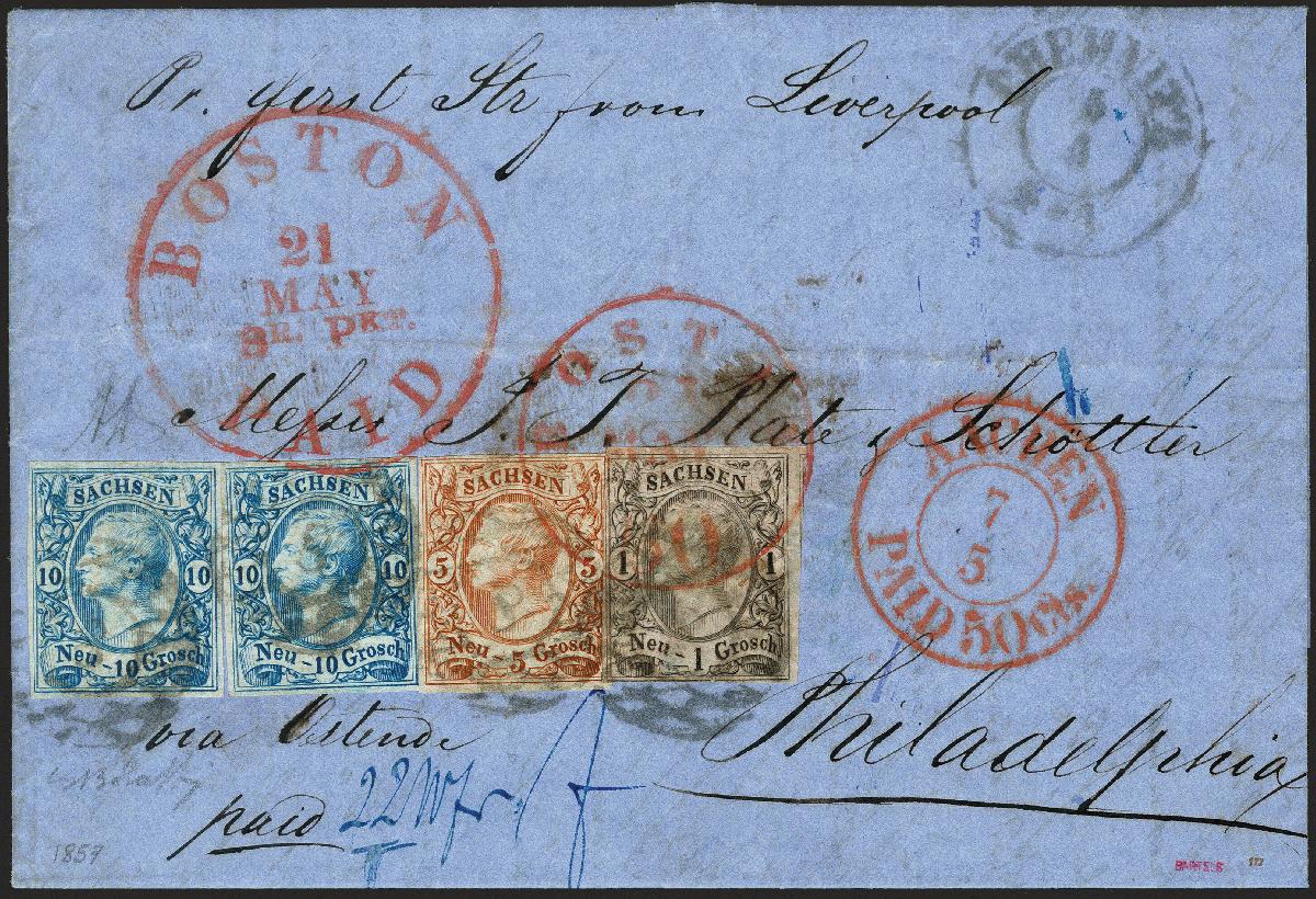 | Zusatzinformationen und Suchstichworte: | 372. Auktion Heinrich Köhler 14. Dezember 2019 Los 266 1 Neugroschen schwarz auf mattgraurot, 5 Neugroschen dunkelzinnoberrot und 2 Einzelwerte 10 Neugroschen cyanblau, letztere in sehr schöner tiefer Farbe, alle farbfrisch und bis auf eine kleine Berührung bei der 1 Neugroschen alle voll- bis breitrandig, mit Nr. "8" und teils übergehenden Transitstempeln, auf komplettem Faltbrief der 2. Gewichtsstufe mit DKr. "CHEMNITZ 5 5" (1857) nach Philadelphia, befördert über die 'Prussian Closed Mail' bis Boston und von dort nach Philadelphia. Ein attraktiver und seltener Brief mit zwei tadellosen 10 Neugroschen-Werten. Signiert Bartels, Alberto Diena und Giulio Bolaffi sowie Fotoattest Vaatz BPP (2019) Ausruf 1.000,00 EUR Zuschlag 1.700,00 EUR (aus der Sammlung Erivan Haub) |