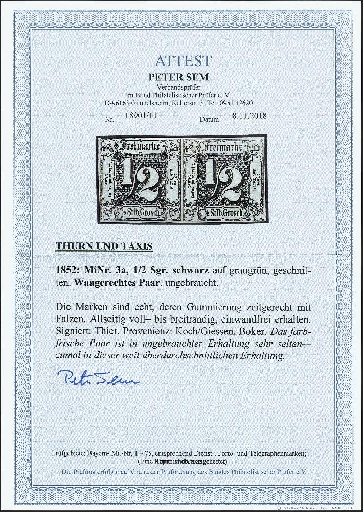 | Zusatzinformationen und Suchstichworte: | 372. Auktion Heinrich Köhler 14. Dezember 2019 Los 272 1852, 1. Ausgabe, ½ Silbergroschen schwarz auf graugrün im waagerechten Paar, sehr schön farbfrisch und voll- bis breitrandig, ungebraucht mit Originalgummi. Eine sehr attraktive und äußerst seltene Einheit. Fotoattest Sem BPP (2018) Ausruf 1.000,00 EUR Zuschlag 5.500,00 EUR (aus der Sammlung Erivan Haub) |