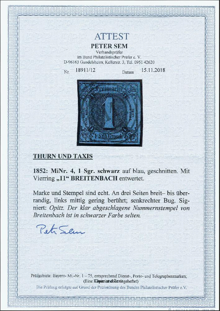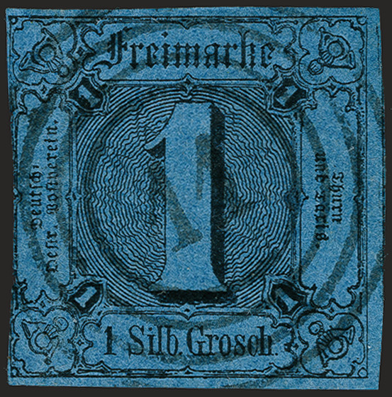| Zusatzinformationen und Suchstichworte: | 372. Auktion Heinrich Köhler 14. Dezember 2019 Los 274 1 Silbergroschen schwarz auf blau in sehr gutem Taxis-Schnitt, zentrisch entwertet durch klar aufgesetzten schwarzen Nummernstempel "11" BREITENBACH. Schwache senkrechte Bugspur, sonst sehr schönes Stück. Ein in schwarzer Farbe sehr seltener Stempel. Fotoattes Sem BPP (2018) Ausruf 200,00 EUR Zuschlag 380,00 EUR (aus der Sammlung Erivan Haub) |