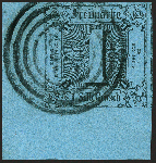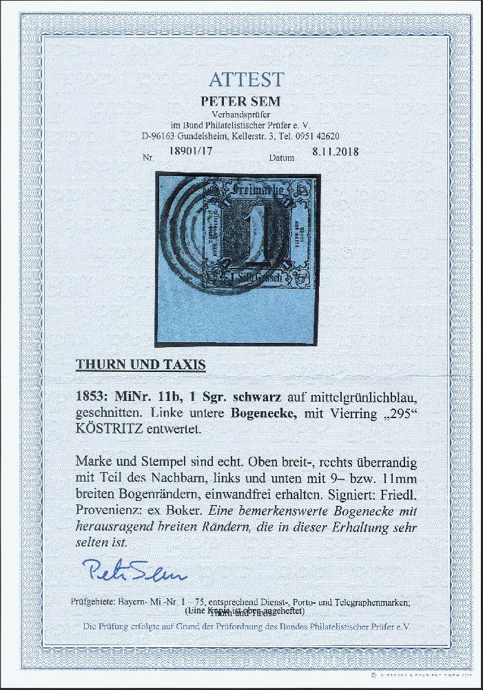 | Zusatzinformationen und Suchstichworte: | 372. Auktion Heinrich Köhler 14. Dezember 2019 Los 278 1853, Farbänderung, 1 Silbergroschen schwarz auf mittelgrünlichblau, allseits voll- bis überrandige linke untere Bogenecke, rechts mit Teil der Nachbarmarke, links und unten mit 9/11 mm Bogenrändern, entwertet durch Nr. "295" KÖSTRITZ. Ein Ausnahmestück. Signiert Friedl und Fotoattest Sem BPP (2018) Ausruf 500,00 EUR Zuschlag 2.200,00 EUR (aus der Sammlung Erivan Haub) |