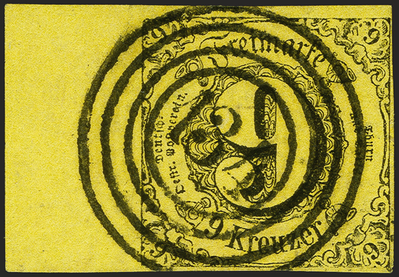 | Zusatzinformationen und Suchstichworte: | 372. Auktion Heinrich Köhler 14. Dezember 2019 Los 281 9 Kreuzer schwarz auf gelb, voll- bis überrandiges linkes Randstück mit 11,5 mm linken Bogenrand, sehr schön entwertet durch zentrische Nr. "134" MAINZ. Luxus. Fotobefund Sem BPP Ausruf 150,00 EUR Zuschlag 850,00 EUR (aus der Sammlung Erivan Haub) |