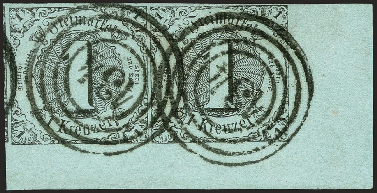 | Zusatzinformationen und Suchstichworte: | 372. Auktion Heinrich Köhler 14. Dezember 2019 Los 282 1856, Farbänderung, 1 Kreuzer schwarz auf bläulichgrün im waagerechten Paar aus der rechten unteren Bogenecke, allseits voll- bis überrandig, links mit Teil der Nachbarmarke, unten und rechts mit 7/13 mm Bogenrand, sauber entwertet durch Nr. "134" MAINZ. Die linke Marke mit gepresstem senkrechten Bug, sonst tadellos. Ein sehr attraktives und in dieser Form außerordentlich seltenes Paar. Signiert Kruschel und Fotoattest Sem BPP (2019) Ausruf 500,00 EUR Zuschlag 2.400,00 EUR (aus der Sammlung Erivan Haub) |