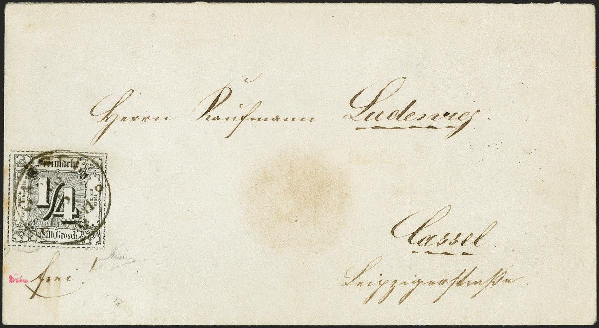 | Zusatzinformationen und Suchstichworte: | 372. Auktion Heinrich Köhler 14. Dezember 2019 Los 286 1866, farbig durchstochene Ausgabe, ¼ Silbergroschen schwarz, allseits tadellos durchstochen, links unten mit kleinem Teil des Bogenrandes, mit sauber aufgesetztem Einkreisstempel "CASSEL 23/5" (1867) auf Ortsbrief-Kuvert mit rückseitigem Distributionsstempel. Das Briefkuvert vorderseitig leichter Siegelfleck, sonst tadellose und sehr schöne Erhaltung. Einzelfrankaturen dieser Marke zählen zu den großen Seltenheiten des Sammelgebietes, mit Ortsstempelentwertung haben wir nur 4 weitere registriert. Signiert Drahn und Friedl sowie Fotoattest Sem BPP (2019) Ausruf 5.000,00 EUR Zuschlag 11.000,00 EUR (aus der Sammlung Erivan Haub) |
