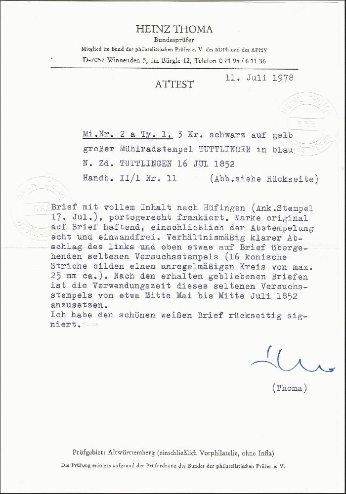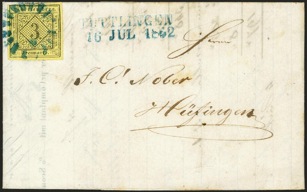 | Zusatzinformationen und Suchstichworte: | 372. Auktion Heinrich Köhler 14. Dezember 2019 Los 288 1851, 3 Kreuzer schwarz auf gelb, voll- bis meist breitrandig mit sauber und übergehend aufgesetztem großen blauen Mühlradstempel von Tuttlingen mit ebenfalls in blau nebengesetztem Langstempel "TUTTLINGEN 16 JUL 1862" auf komplettem Faltbrief nach Hüfingen mit Ankunftsstempel vom nächsten Tag. Ein rückseitiges Siegel ausgeschnitten, das Briefpapier außerhalb der Frankatur minimalst fleckig, sonst einwandfreie und sehr schön frische und ursprüngliche Erhaltung. Dieser auch 'Große Sonne' genannte Versuchsstempel wurde nur von Mitte Mai bis Mitte Juli 1852 verwendet und ist auf Brief außerordentlich selten. Von den 10 von uns registrierten Briefen mit diesem Stempel ist dies der späteste und zugleich einer der attraktivsten. Fotoattest Thoma BPP (1978) Ausruf 3.000,00 EUR Zuschlag 3.200,00 EUR (aus der Sammlung Erivan Haub) |