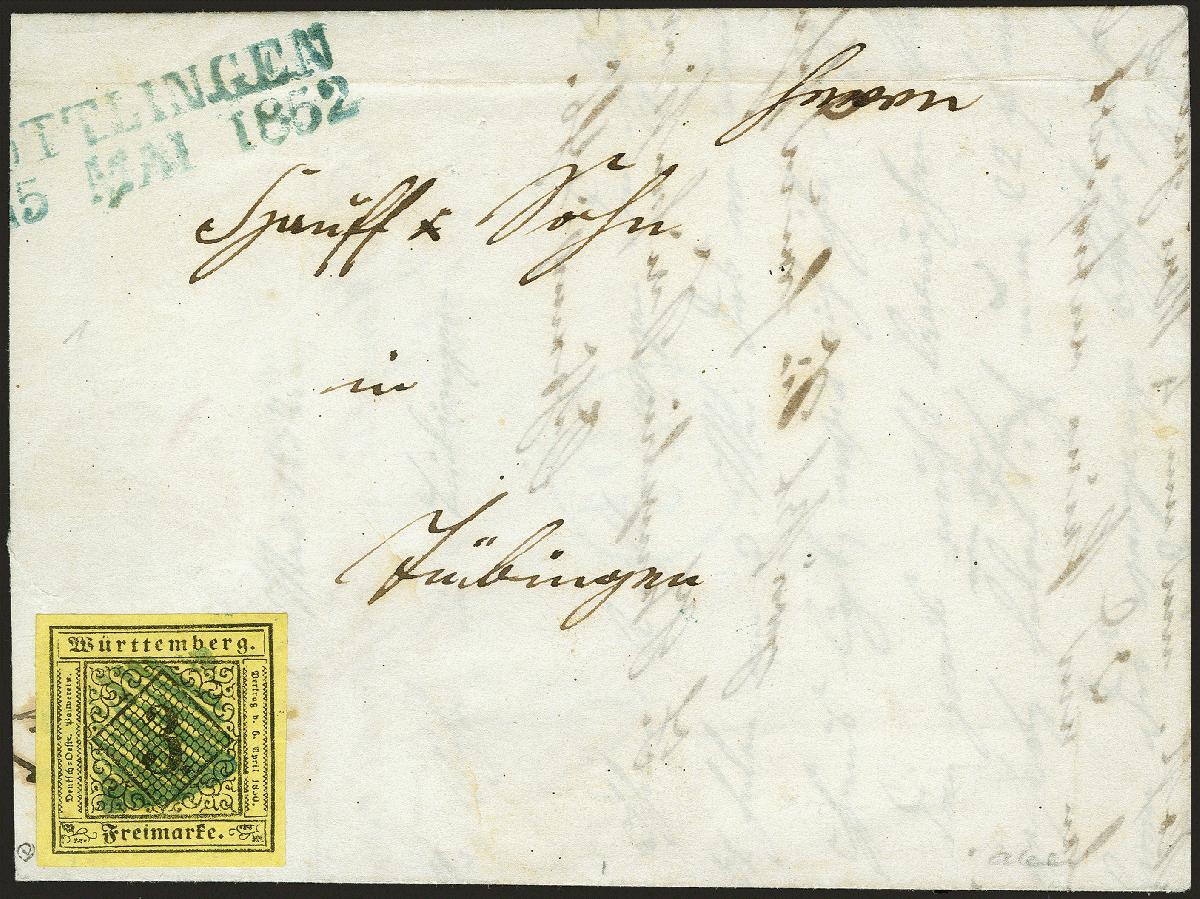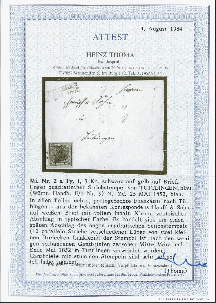 | Zusatzinformationen und Suchstichworte: | 372. Auktion Heinrich Köhler 14. Dezember 2019 Los 289 3 Kreuzer schwarz auf gelb, sehr schön farbfrisch und allseits breitrandig mit zentrisch aufgesetztem engen quadratischen Strichstempel von Tuttlingen mit nebengesetztem Aufgabestempel "TUTTLINGEN 25 MAI 1852" auf komplettem Faltbrief nach Tübingen. Ein attraktiver und sehr seltener Brief in frischer und ursprünglicher Erhaltung. Mit diesem Versuchsstempel haben wir insgesamt 8 Briefe zwischen dem 8. April und 25. Mai 1852 registriert, davon 6 mit einer 3 Kreuzer-Frankatur. Signiert Thoma BPP mit Fotoattest (1984) Ausruf 3.000,00 EUR Zuschlag 3.000,00 EUR (aus der Sammlung Erivan Haub) |