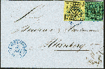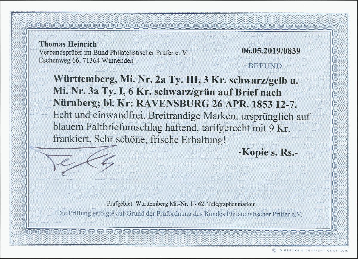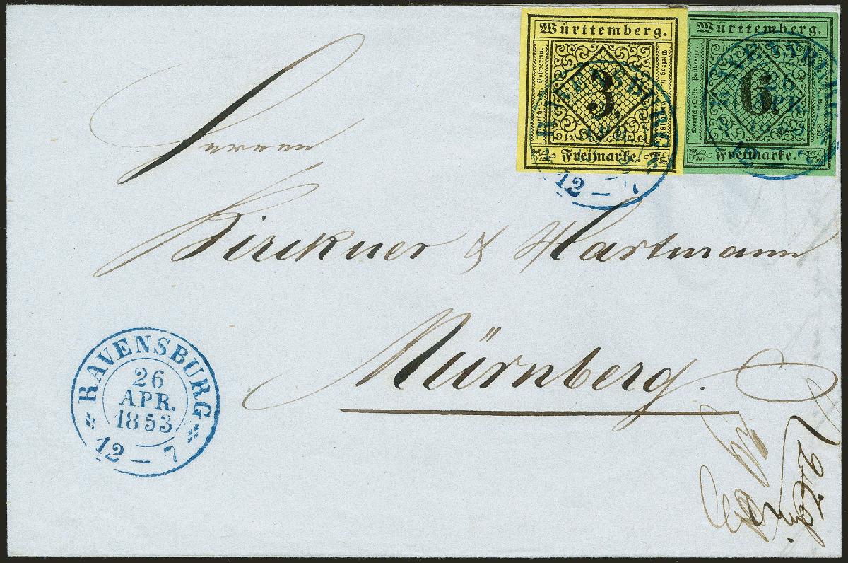 | Zusatzinformationen und Suchstichworte: | 372. Auktion Heinrich Köhler 14. Dezember 2019 Los 291 6 Kreuzer schwarz auf grün in Type I und 3 Kreuzer schwarz auf gelb in Type III, beide farbfrisch und voll- bis breitrandig mit blauem DKr. "RAVENSBURG 26 APR. 1853", zusätzlich nebengesetzt, auf Briefhülle nach Nürnberg. Ein sehr schöner und frischer Brief in den Postverein. Fotobefund Heinrich BPP Ausruf 150,00 EUR Zuschlag 550,00 EUR (aus der Sammlung Erivan Haub) |