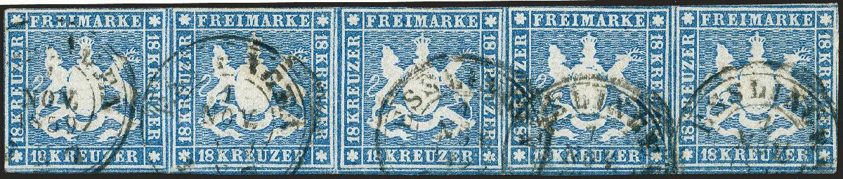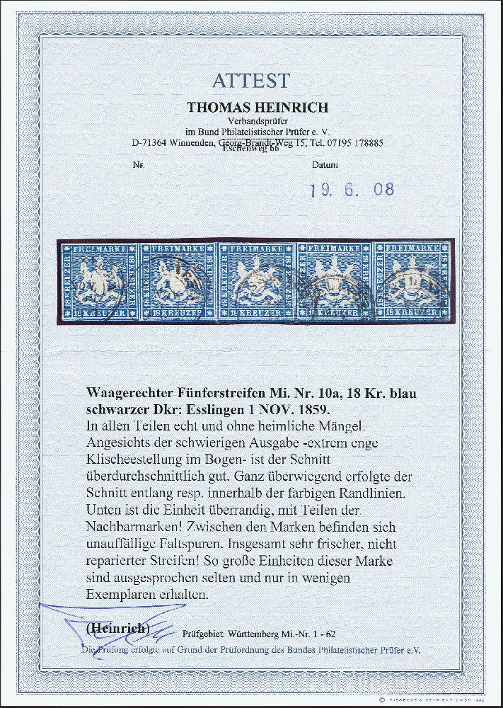 | Zusatzinformationen und Suchstichworte: | 372. Auktion Heinrich Köhler 14. Dezember 2019 Los 293 1857, Wappenausgabe mit Seidenfaden, 18 Kreuzer hellblau im waagerechten 5er-Streifen, farbfrisch und für diese Ausgabe überdurchschnittlich gut geschnitten, unten mit Teilen aller Nachbarmarken, entwertet durch Kreisstempel "ESSLINGEN 1 NOV. 1859". Zwischen den Marken leichte Vorfaltspuren, sonst tadellos. Es handelt sich hier um die größte bekannte gestempelte Einheit dieser Marke. Wir haben noch 3 weitere 5er-Streifen registriert, dabei handelt es sich jedoch durchweg um senkrechte Streifen auf Briefen. Als waagerechte Einheit Unikat. Eines der Spitzenstücke der 2. Ausgabe. Fotoattest Heinrich BPP (2008) Ausruf 8.000,00 EUR Zuschlag 18.000,00 EUR (aus der Sammlung Erivan Haub) |