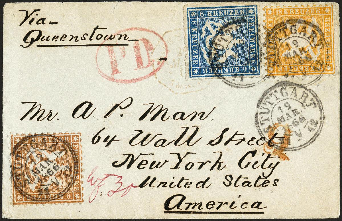 | Zusatzinformationen und Suchstichworte: | 372. Auktion Heinrich Köhler 14. Dezember 2019 Los 295 9 Kreuzer rötlichbraun und 18 Kreuzer orange in Mischfrankatur mit 1865, durchstochene Ausgabe 6 Kreuzer blau mit sauber auf- und nebengesetztem Kreisstempel "STUTTGART 19 MAR. 1866" auf kleinem Briefkuvert über die badische Bahnpost und Frankreich nach New York mit ausgewiesenem Weiterfranko von 30 Kreuzern, portogerecht frankiert nach dem Tarif vom 1.7.1857. Die 18 Kreuzer mit kleinen Korrekturen, sonst einwandfrei. Eine attraktive und seltene Farbfrankatur. Signiert Thoma BPP und Fotoattest Heinrich BPP (2019) Ausruf 1.000,00 EUR Zuschlag 4.400,00 EUR (aus der Sammlung Erivan Haub) |
