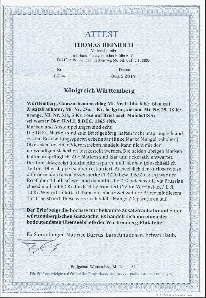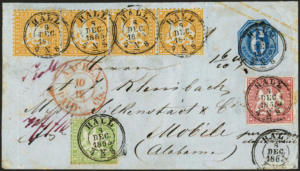 | Zusatzinformationen und Suchstichworte: | 372. Auktion Heinrich Köhler 14. Dezember 2019 Los 296 1863/64, 18 Kreuzer orange, 4 Stück als Streifen geklebt und 1 Kreuzer gelbgrün, in Mischfrankatur mit 1865/67, 3 Kreuzer rosa als Zufrankatur auf Ganzsachenumschlag 6 Kreuzer blau mit mehrfach sauber aufgesetztem Kreisstempel "HALL 8 DEC. 1865" als Brief der 2. Gewichtsstufe über die 'Prussian Closed Mail' nach Mobile im Staate Alabama mit vorderseitigem roten "AACHEN PAID Cts.". Die 18 Kreuzer-Werte waren gelöst und zeigen Bearbeitungsspuren, bei der linken Marke einige Zähne ergänzt; im Umschlag einige Flecken entfernt, sonst einwandfrei. Ein dekorativer Brief mit seltener Frankaturkombination; laut Fotoattest Heinrich BPP größte ihm bekannte Zufrankatur auf einer württembergischen Ganzsache. Signiert Schwenn und Fotoatteste Thoma BPP (1975) und Heinrich BPP (2019) Ausruf 3.000,00 EUR Zuschlag 17.000,00 EUR (aus der Sammlung Erivan Haub) |