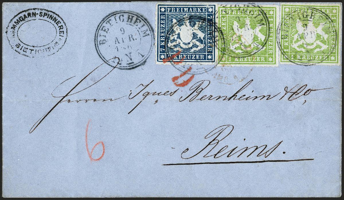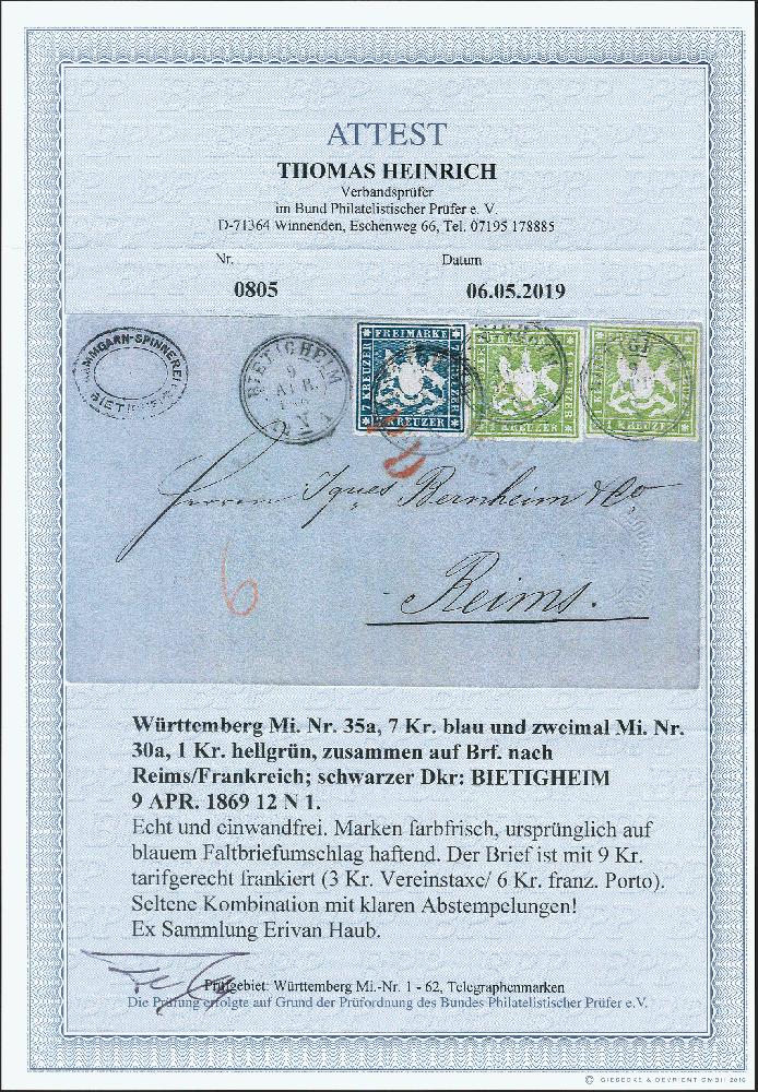 | Zusatzinformationen und Suchstichworte: | 372. Auktion Heinrich Köhler 14. Dezember 2019 Los 297 1865/68, Wappenausgabe durchstochen, 1 Kreuzer hellgrün, 2 Einzelwerte, zusammen mit 7 Kreuzer blau, alle farbfrisch und gut durchstochen, als Streifen geklebt mit Kreisstempel "BIETIGHEIM 9 APR. 1869" auf Briefhülle nach Reims mit 6 Kreuzern ausgewiesenem Weiterfranko. Schöne und einwandfreie Erhaltung. Fotoattest Heinrich BPP (2019) Ausruf 150,00 EUR Zuschlag 700,00 EUR (aus der Sammlung Erivan Haub) |
