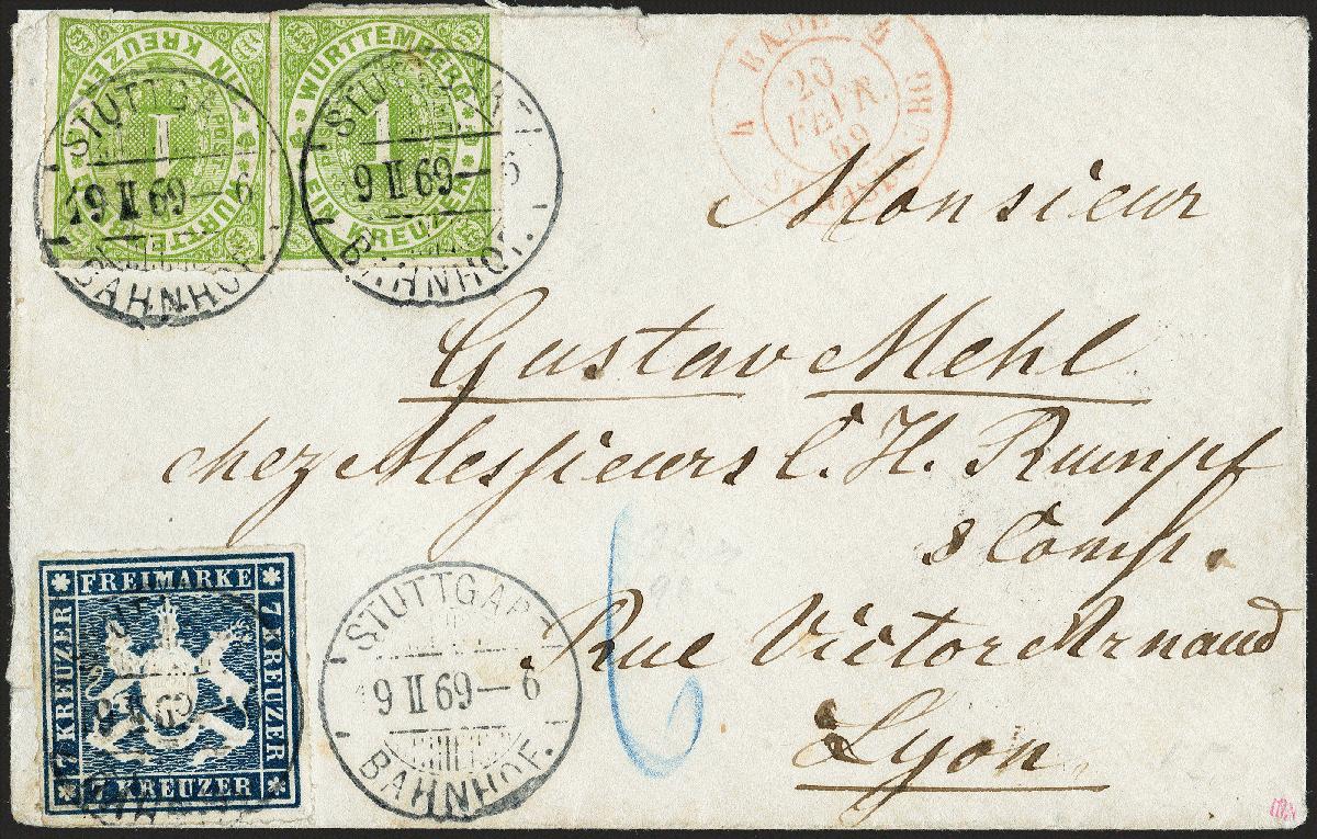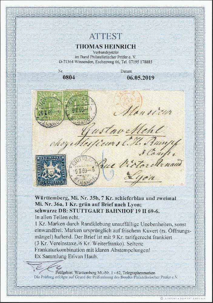 | Zusatzinformationen und Suchstichworte: | 372. Auktion Heinrich Köhler 14. Dezember 2019 Los 298 1868, Wappen 7 Kreuzer schieferblau in Mischfrankatur mit 1869, Ziffernausgabe 1 Kreuzer grün, 2 Einzelwerte, mit Brückenstempel "STUTTGART BAHNHOF 9 II 69" auf kleinem Briefkuvert nach Frankreich mit 6 Kreuzern ausgewiesenem Weiterfranko. Die 1 Kreuzer-Werte durch Randklebung unauffällige Unebenheiten, sonst einwandfrei. Fotoattest Heinrich BPP (2019) Ausruf 300,00 EUR Zuschlag 600,00 EUR (aus der Sammlung Erivan Haub) |