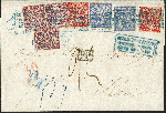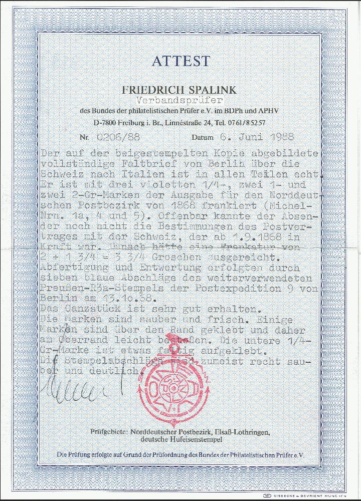 | Zusatzinformationen und Suchstichworte: | 372. Auktion Heinrich Köhler 14. Dezember 2019 Los 301 1868, Durchstochene Ausgabe ¼ Groschen violett, 3 Einzelwerte zusammen mit je 2 Exemplaren 1 Groschen karmin und 2 Groschen ultramarin, mit blauem Rahmenstempel "BERLIN POST-EXP.9 / POTSDAM.BAHNH. 13 10 68" auf komplettem Faltbrief über die Schweiz nach Rom mit rückseitigen Transit- und Ankunftsstempeln. Der Brief ist noch frankiert nach dem Tarif von 1861, obwohl seit 1. September 1868 ein neuer vergünstigter Tarif galt. Nach wie vor war der Brief bezahlt bis zur Grenze des Kirchenstaates, das dortige Inlandsporto in Höhe von "25" Centesimi vorderseitig notiert und vom Empfänger eingezogen. Der Brief befindet sich in guter ursprünglicher Erhaltung, 3 Werte durch Randklebung leicht bestoßen und eine ¼ Groschen-Marke mit Aufklebefalte. Ein interessanter und attraktiver Brief. Fotoattest Spalink BPP (1988) und Befund Van der Linden BPP. Ausruf 300,00 EUR Zuschlag 400,00 EUR (aus der Sammlung Erivan Haub) |