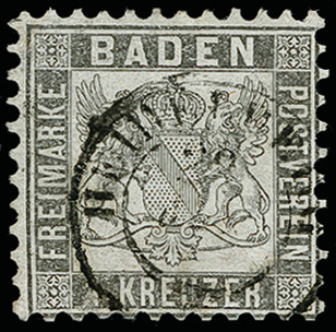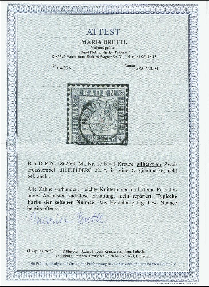 | Zusatzinformationen und Suchstichworte: | 373. Auktion Heinrich Köhler 23.-27. Juni 2020 Los 2849 1862, Wappenausgabe 1 Kr. silbergrau, farbfrisch und bis auf eine leichte Aufklebeknitterung und einen bestoßenen Eckzahn oben rechts in tadelloser Erhaltung, sauber entwertet durch DKr. von Heidelberg; ein schönes Stück dieser seltenen Marke, Fotoattest Brettl BPP (2004) und Stegmüller BPP (2019) (Mi. 3.000,-) Zuschlag 650,00 EUR |