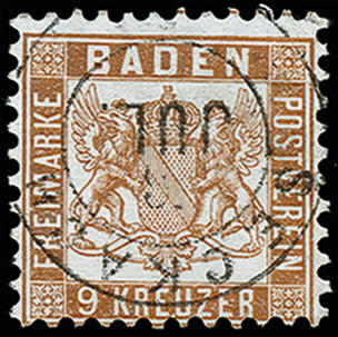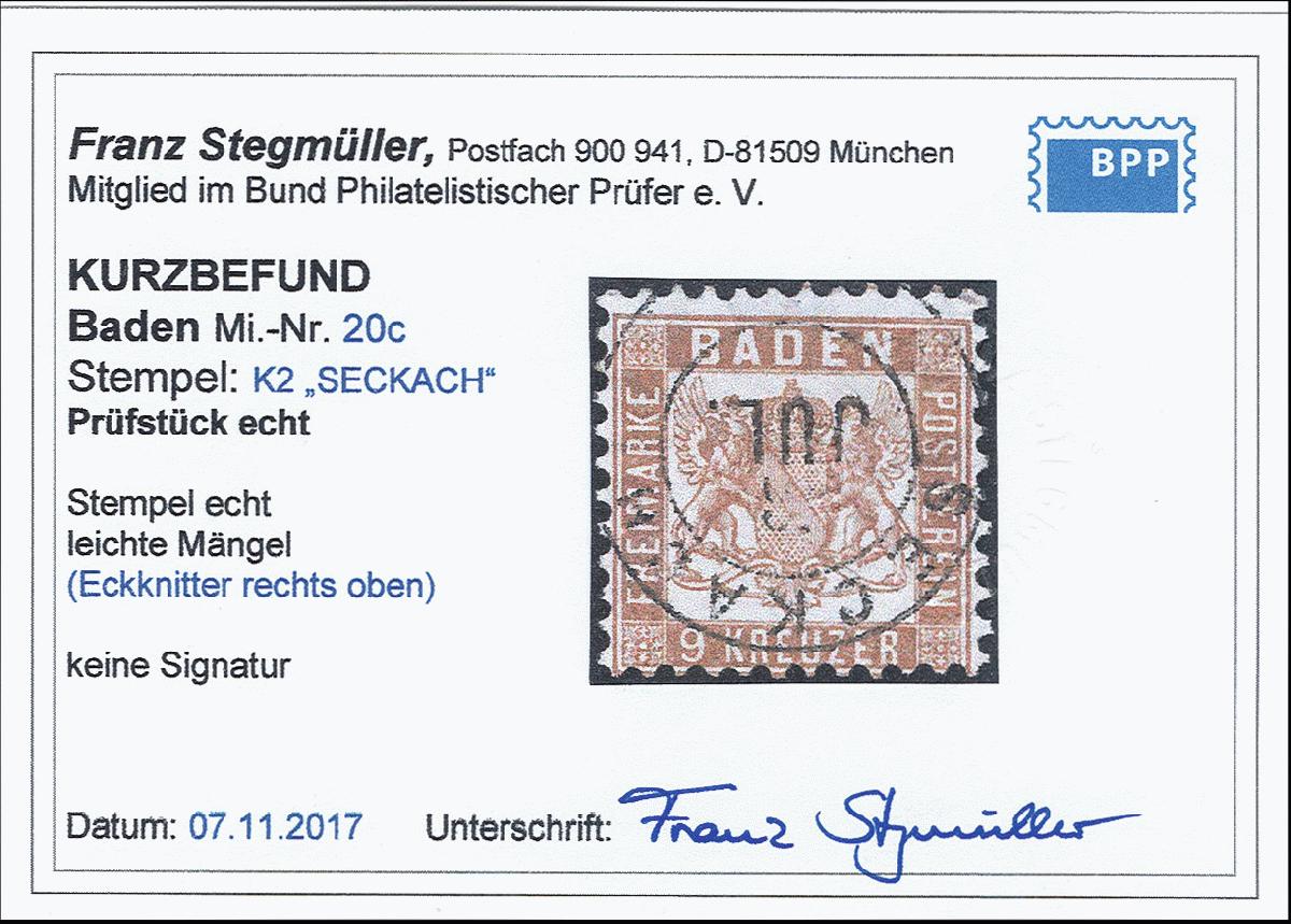 | Zusatzinformationen und Suchstichworte: | 373. Auktion Heinrich Köhler 23.-27. Juni 2020 Los 2851 1862/66, 9 Kr. dunkelbraun, farbfrisch und gut gezähnt mit sauber aufgesetztem DKr. von Seckach; rechts oben minimaler Eckknitter, sonst einwandfrei, seltene Farbe, Kurzbefund Stegmüller BPP Zuschlag 135,00 EUR |