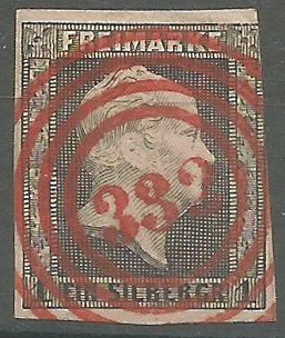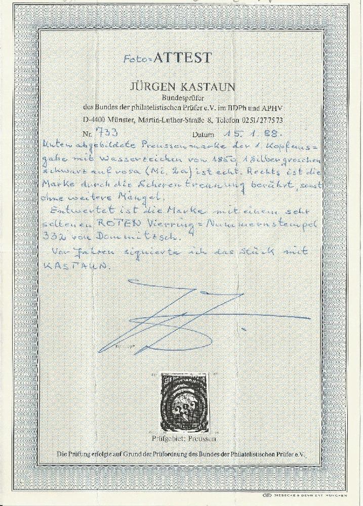 | Zusatzinformationen und Suchstichworte: | ebay.de Pr.-Nr. 112 Pr. - Nr.-o / 332 Dommitzsch leuchtend ROTER ideal zentrierter, gerader und glasklarer TRAUMABSCHLAG des farbig extrem RAREN Nummernstempels auf rechts oben ecktangierter, sonst vollrand 2a, geprüft m. Fotoattest Kastaun. Ein äußerst repräsentatives Liebhaberstück mit in dieser Klarheit kaum angebotener Stempelrarität! Preis 1.100,00 EUR Quelle Stegers (Friebel's) |