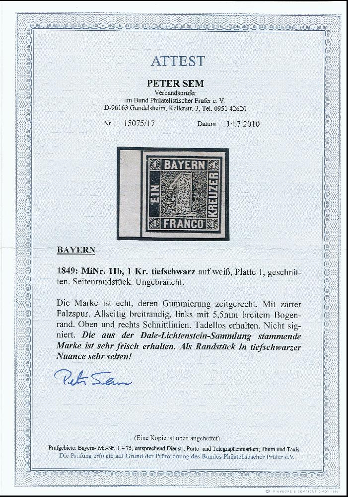 | Zusatzinformationen und Suchstichworte: | 373. Auktion Heinrich Köhler 23.-27. Juni 2020 Los 2861 1849, 1 Kr. tiefschwarz, Platte 1, links mit 5,5 mm breitem Bogenrand, allseits breitrandig mit Schnittlinien oben und rechts, ungebraucht mit zarter Falzspur, tadellos, als Randstück in tiefschwarzer Nuance sehr selten, unsigniert mit Fotoattest Schmitt BPP (1992) und Sem BPP (2010) (Sem 4.000,-) Zuschlag 2.200,00 EUR |