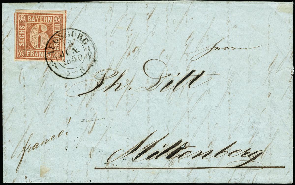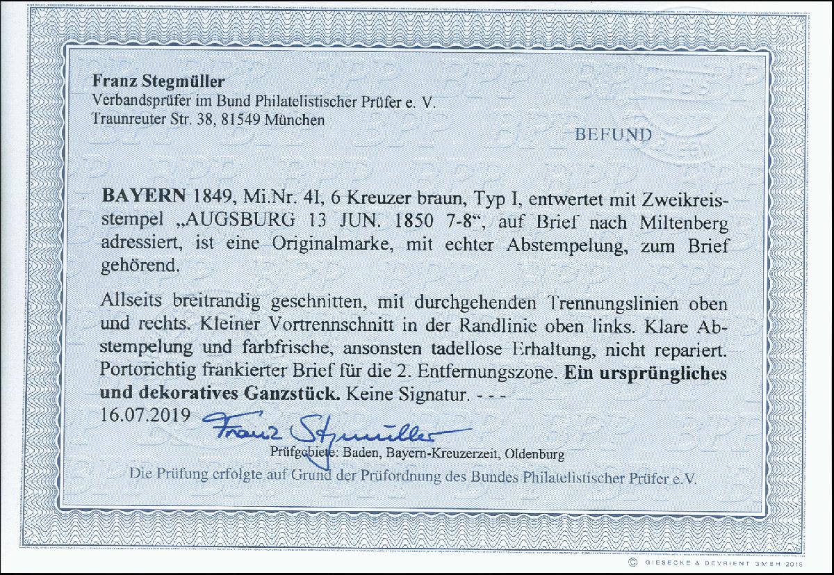 | Zusatzinformationen und Suchstichworte: | 373. Auktion Heinrich Köhler 23.-27. Juni 2020 Los 2872 6 Kr. braunorange, gut voll- bis meist breitrandig und farbfrisch mit klar und übergehend aufgesetztem DKr. "AUGSBURG 13 JUN. 1850" auf Faltbrief nach Miltenberg; kleiner Vortrennschnitt in der Randlinie oben links, sonst einwandfrei; ein schönes Stück, Fotobefund Stegmüller BPP Zuschlag 170,00 EUR |