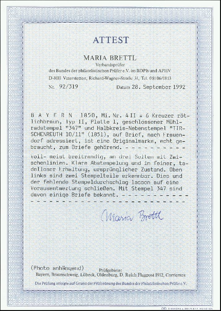 | Zusatzinformationen und Suchstichworte: | 373. Auktion Heinrich Köhler 23.-27. Juni 2020 Los 2886 6 Kreuzer braun, voll- bis sehr breitrandig mit Vorausentwertung durch gMR "347" (weitere Stempelteile am Oberrand) auf kleinem Faltbrief mit nebengesetztem Halbkreis "TIRSCHENREUTH 10/11" (1851) nach Frauendorf bei Vilshofen; links etwas umgefaltet, sonst einwandfrei, Fotoattest Brettl BPP (1992) Ausruf 250,00 EUR |