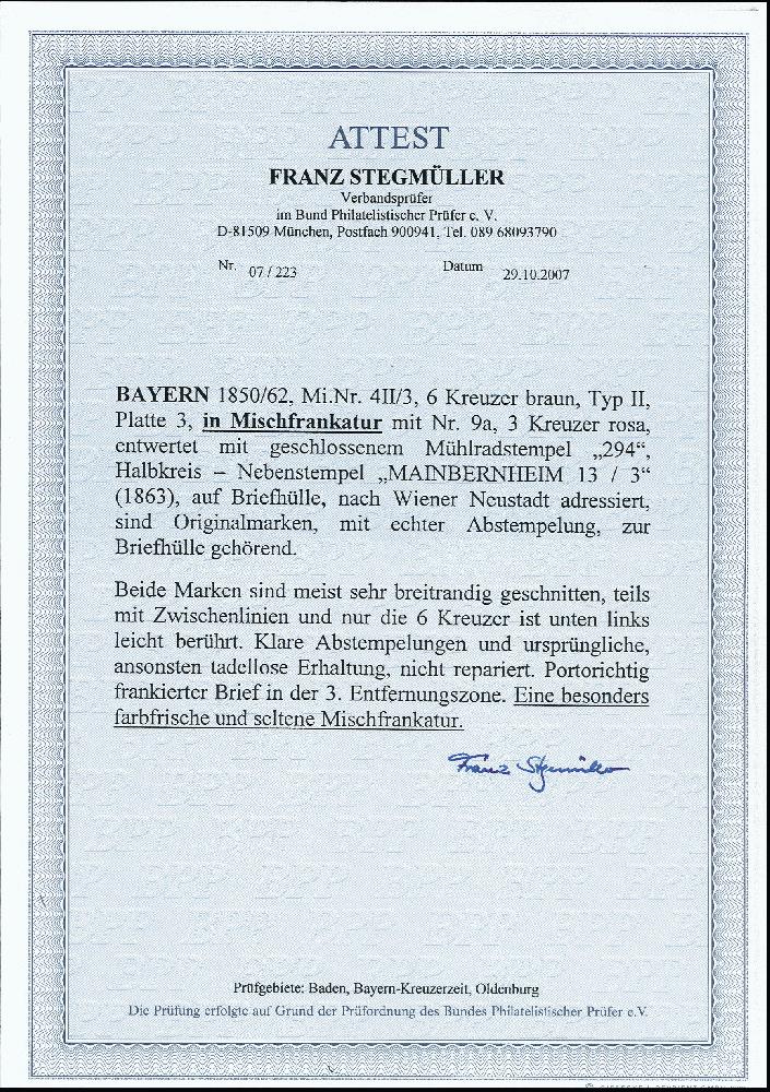| Zusatzinformationen und Suchstichworte: | 373. Auktion Heinrich Köhler 23.-27. Juni 2020 Los 2889 6 Kreuzer braun, unten links leicht berührt, sonst voll- bis breitrandig in Mischfrankatur mit 1862, 3 Kreuzer rosa, allseits breitrandig, beide entwertet durch besonders klaren gMR "294" auf Briefhülle mit nebengesetztem Halbkreis "MAINBERNHEIM 13 3" nach Wien Neustadt. Leichte Brieffaltungen außerhalb der Frankatur, sonst einwandfrei. Ein attraktiver Brief im Wechselverkehr mit Österreich; signiert Pfenninger sowie Fotoatteste Brettl BPP (1995) und Stegmüller BPP (2007) Zuschlag 600,00 EUR |