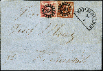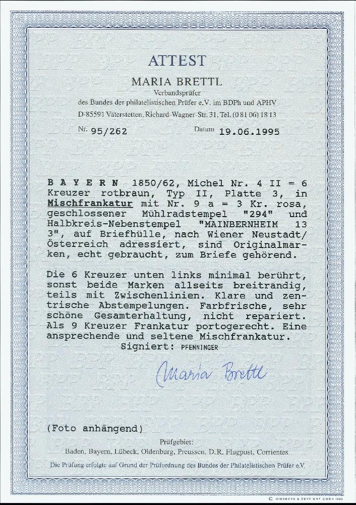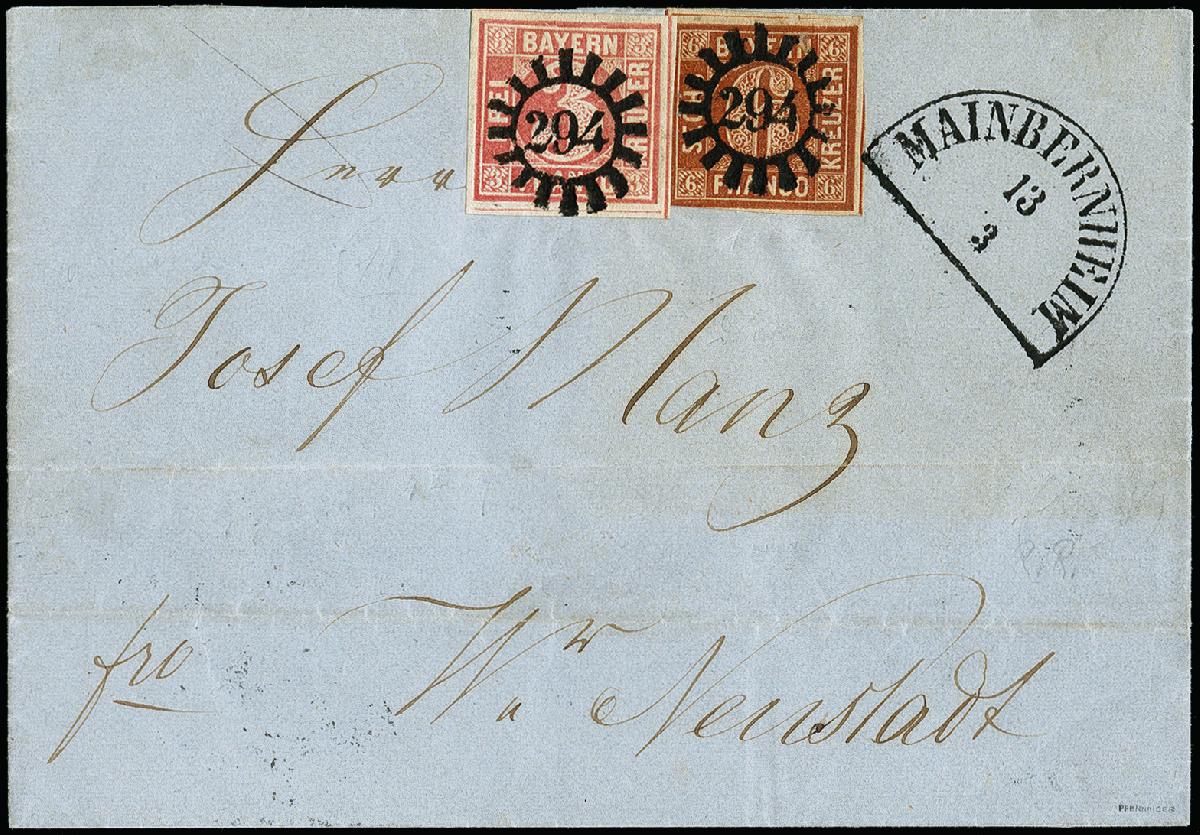 | Zusatzinformationen und Suchstichworte: | 373. Auktion Heinrich Köhler 23.-27. Juni 2020 Los 2889 6 Kreuzer braun, unten links leicht berührt, sonst voll- bis breitrandig in Mischfrankatur mit 1862, 3 Kreuzer rosa, allseits breitrandig, beide entwertet durch besonders klaren gMR "294" auf Briefhülle mit nebengesetztem Halbkreis "MAINBERNHEIM 13 3" nach Wien Neustadt. Leichte Brieffaltungen außerhalb der Frankatur, sonst einwandfrei. Ein attraktiver Brief im Wechselverkehr mit Österreich; signiert Pfenninger sowie Fotoatteste Brettl BPP (1995) und Stegmüller BPP (2007) Zuschlag 600,00 EUR |
