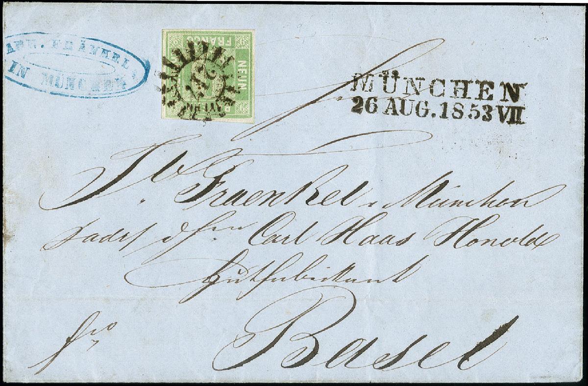 | Zusatzinformationen und Suchstichworte: | 373. Auktion Heinrich Köhler 23.-27. Juni 2020 Los 2890 SCHWEIZ: 1850/58, 9 Kreuzer bläulichgrün, Type II, farbfrisch und voll- bis breitrandig mit gMR "217" und sauber nebengesetztem L2 "MÜNCHEN 26 AUG. 1853" auf Briefhülle nach Basel. Der Brief war mit 15 Kreuzern bis zum Bestimmungsort voll bezahlt, jedoch vertragsgemäß nur die Postvereinsgebühr frankiert, das Weiterfranko in Höhe von "6" Kreuzern rückseitig notiert. Ein attraktiver und seltener Brief mit geteiltem Franko; Fotoattest Schmitt BPP (2002) Zuschlag 950,00 EUR |