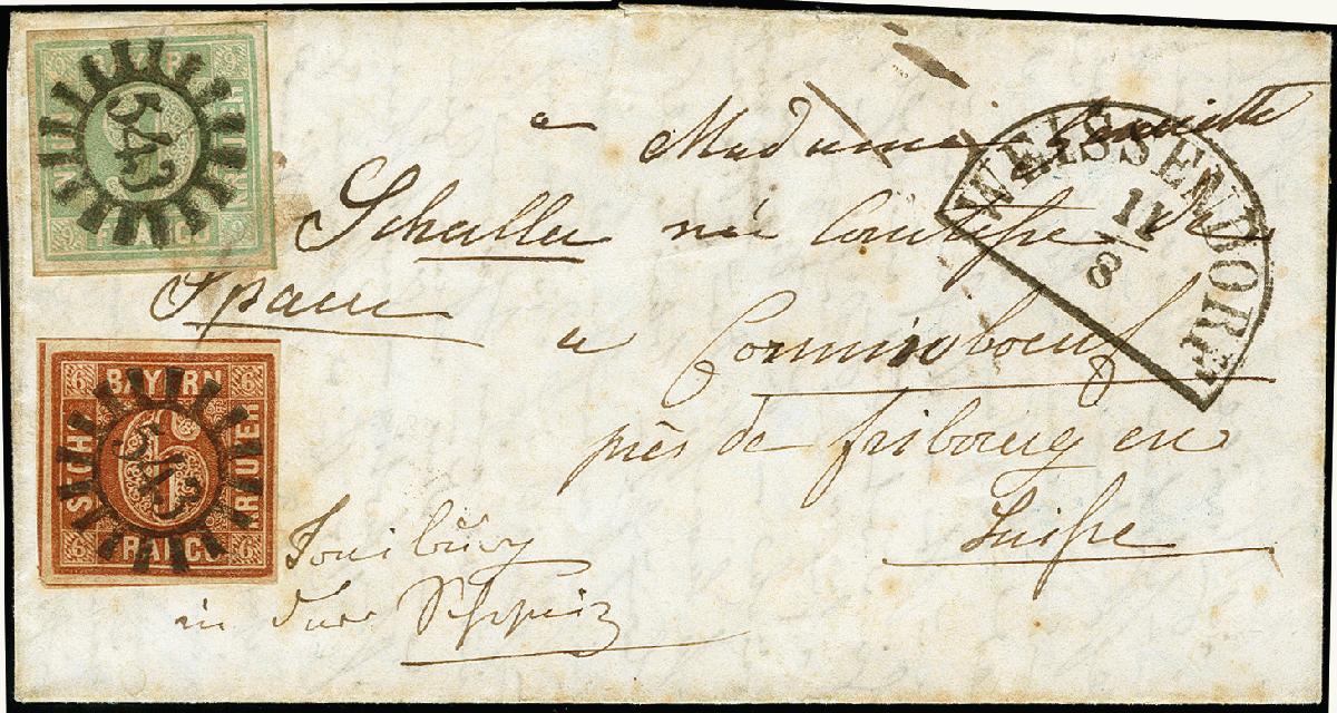 | Zusatzinformationen und Suchstichworte: | 373. Auktion Heinrich Köhler 23.-27. Juni 2020 Los 2891 SCHWEIZ: 9 Kreuzer blaugrün, Type 3, mit 6 Kreuzer braun, beide voll- bis meist breitrandig mit jeweils klar aufgesetztem gMR "543" und nebengesetztem Halbkreis "WEISSENDORF 11/8" (1854) auf kleinem Faltbrief nach Corminboeuf bei Freiburg. Die 9 Kreuzer gering fleckig, sonst einwandfrei und attraktiv. Fotoattest Brettl BPP (1987) Zuschlag 220,00 EUR |