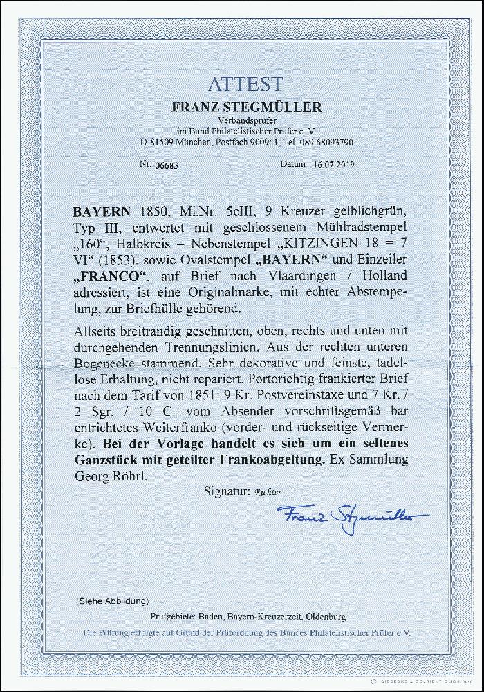 | Zusatzinformationen und Suchstichworte: | 373. Auktion Heinrich Köhler 23.-27. Juni 2020 Los 2893 9 Kr. maigrün, Type III, farbfrisch und allseits breitrandig mit zentrisch aufgesetztem gMR "160" auf kpl. Faltbrief mit nebengesetztem Halbkreis "KITZINGEN 18=7" (1853) sowie Ovalstempel "BAYERN" und L1 "FRANCO" nach Vlaardingen in Holland. Der Brief war mit 16 Kr. voll bezahlt, der Auslandsanteil in Höhe von "7" Kr. rückseitig vermerkt und vorderseitig notiert als "10" holländische Cent. Ein attraktiver und seltener Auslandsbrief mit 'geteiltem Franko'. Sign. Richter und Fotoattest Stegmüller BPP (2019) Zuschlag 1.900,00 EUR |