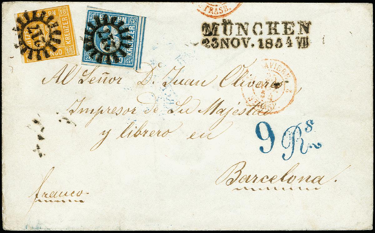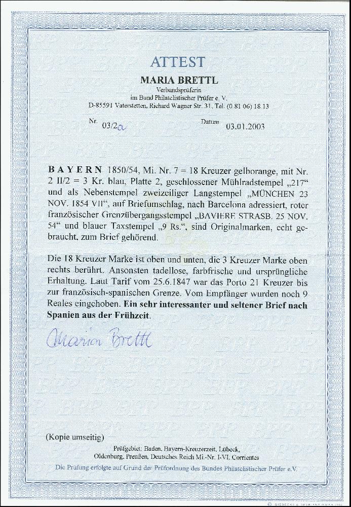 | Zusatzinformationen und Suchstichworte: | 373. Auktion Heinrich Köhler 23.-27. Juni 2020 Los 2900 SPANIEN: 1850/58, 18 Kreuzer gelborange, oben und unten berührt, sonst voll- bis breitrandig mit leicht berührter 3 Kreuzer blau, mit jeweils sauber aufgesetztem gMR "217" und sauber nebengesetztem L2 "MÜNCHEN 23 NOV. 1854" auf Briefkuvert nach Barcelona. Der Brief ist portogerecht frankiert nach dem Tarif vom 25.6.1847 und war bezahlt bis zur französisch-spanischen Grenze. Das spanische Inlandsporto in Höhe von "9 Rs." wurde vom Empfänger eingezogen. Ein attraktiver und sehr seltener früher Brief nach Spanien. Fotoattest Brettl BPP (2003) Ausruf 1.300,00 EUR |