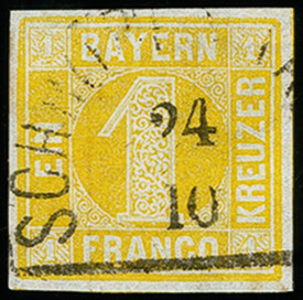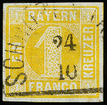 | Zusatzinformationen und Suchstichworte: | 373. Auktion Heinrich Köhler 23.-27. Juni 2020 Los 2903 1862, Farbänderung, 1 Kr. gelb in Type II mit abgeschrägten Ecken, sehr schön farbfrisch und allseits voll- bis meist breitrandig, rechts und unten mit Teilen der Schnittlinien, sauber und leicht entwertet durch zentrisch aufgesetzten Halbkreisstempel von Schrobenhausen. Ein sehr schönes und tadelloses Stück dieser seltenen und schwierigen Marke. Fotoattest Sem BPP (2019) Zuschlag 1.000,00 EUR |