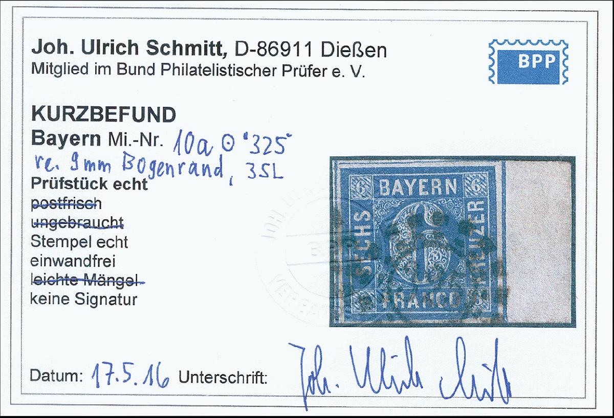 | Zusatzinformationen und Suchstichworte: | 373. Auktion Heinrich Köhler 23.-27. Juni 2020 Los 2907 6 Kr. blau, voll- bis meist breitrandiges rechtes Randstück mit ca. 9 mm Bogenrand, sauber entwertet durch oMR "325" MÜNCHEN; Kurzbefund Schmitt BPP Zuschlag 130,00 EUR |