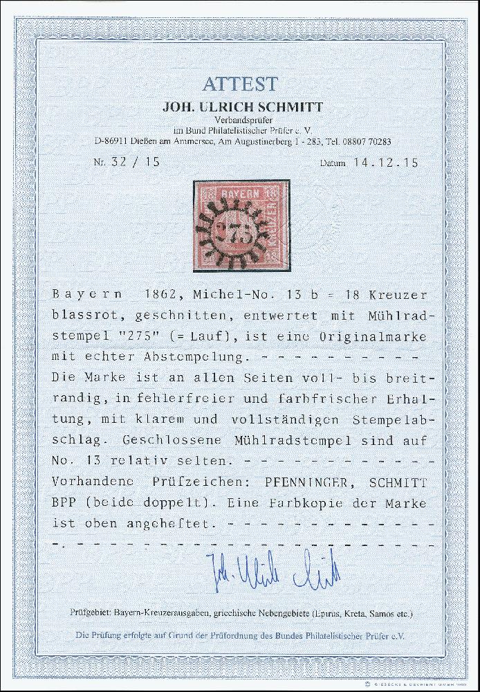 | Prüfer: | Schmitt, Joh. Ulrich (BPP (Bund Philatelistischer Prüfer)) |