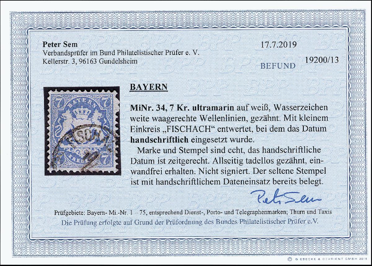 | Zusatzinformationen und Suchstichworte: | 373. Auktion Heinrich Köhler 23.-27. Juni 2020 Los 2932 1875, Wz. Wellen, 7 Kr. ultramarin, farbfrisch und gut gezähnt, entwertet durch seltenen kleinen EKr. "FISCHACH" mit handschriftlichem Datum; Fotobefund Sem BPP (2019) Zuschlag 130,00 EUR |