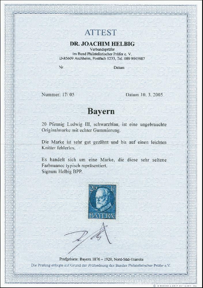 | Zusatzinformationen und Suchstichworte: | 373. Auktion Heinrich Köhler 23.-27. Juni 2020 Los 2935 1914, Ludwig Friedensdruck 20 Pfg. schwarzblau, farbfrisch und gut gezähnt, ungebraucht mit sauberer Falzspur, minimale Knitterspur, sonst einwandfrei, eine seltene Marke, Fotoattest Dr. Helbig BPP (2005) Zuschlag 450,00 EUR |