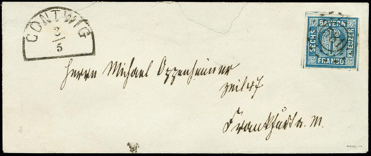 | Zusatzinformationen und Suchstichworte: | 373. Auktion Heinrich Köhler 23.-27. Juni 2020 Los 2942 "581" CONTWIG, klar und zentrisch auf 6 Kr. blau, oben winzig berührt, sonst voll- bis breitrandig auf kleinem Briefkuvert mit sauber nebengesetztem Halbkreisstempel "CONTWIG 3/5" nach Frankfurt a. M.; die Verschlußklappe war abgetrennt und neu eingesetzt, dadurch bedingte vorderseitige Einrisse verklebt; ein auf Brief seltener Stempel, sign. Pfenninger und Fotoattest Sem BPP (2016) Ausruf 700,00 EUR |